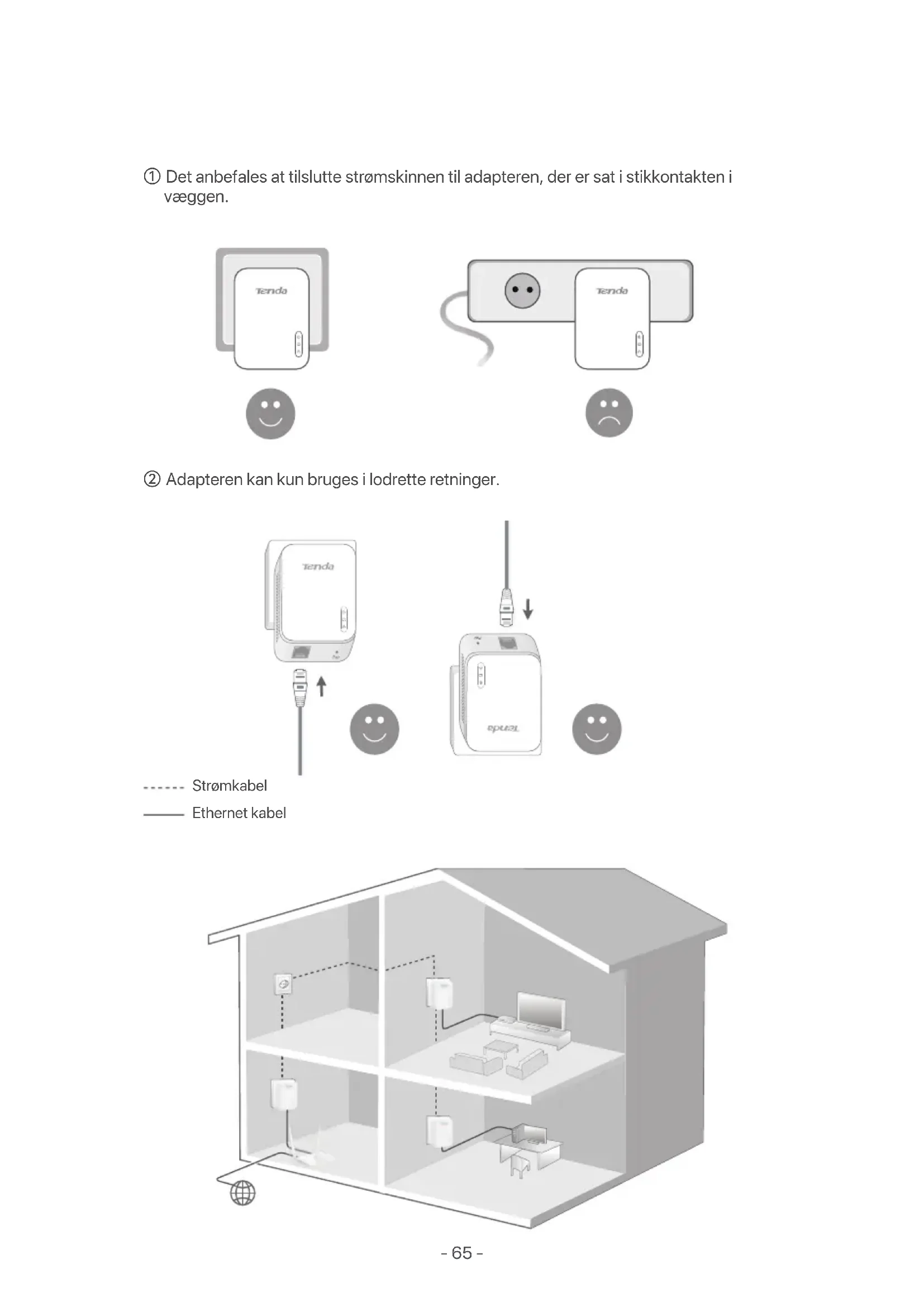 - Upotrijebite gumb Pair da biste ga ponovno uparili s drugim adapterom u električnoj mreži. A3: Isprobajte sljedeće metode:- 65 - Dansk Opmærksomhed ② Adapteren kan kun bruges i lodrette retninger. ① Det anbefales at tilslutte strømskinnen til adapteren, der er sat i stikkontakten i væggen. Strømkabel Ethernet kabel- 66 - Tilslut en adapter til en LAN-port på en router for internetadgang, og sæt den i en stikkontakt i nærheden. Slut den anden adapter til en kablet enhed, såsom en set-top-boks, og sæt den i en stikkontakt i væggen. Vent, indtil PLC LED-indikatorerne på de to adaptere lyser konstant.- 67 - (Valgfrit) Sikre dit Powerline-netværk