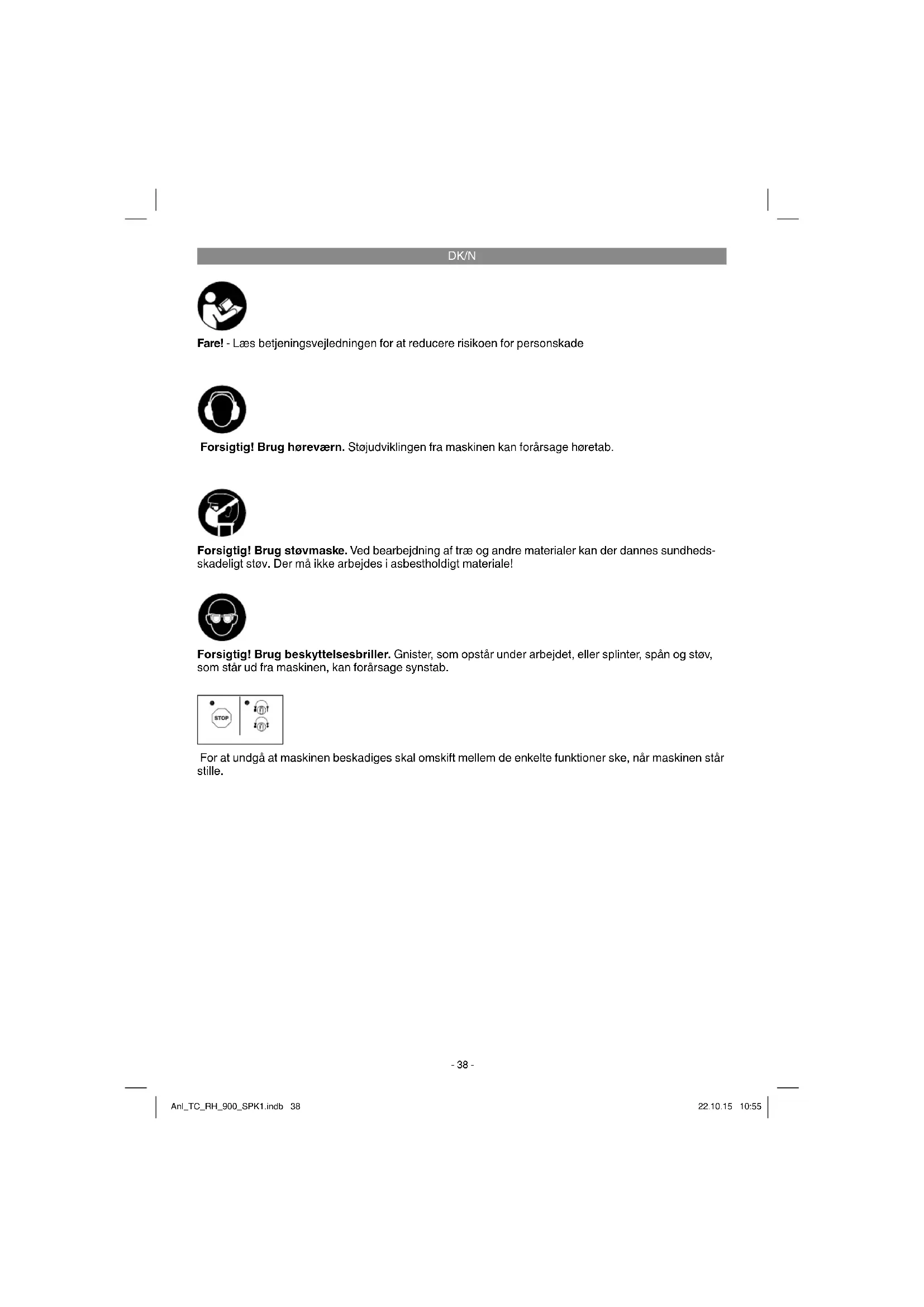 Fare! - Læs betjeningsvejledningen for at reducere risikoen for personskade Forsigtig! Brug høreværn. Støjudviklingen fra maskinen kan forårsage høretab. Forsigtig! Brug beskyttelsesbriller. Gnister, som opstår under arbejdet, eller splinter, spån og støv, som står ud fra maskinen, kan forårsage synstab. Forsigtig! Brug støvmaske. Ved bearbejdning af træ og andre materialer kan der dannes sundheds- skadeligt støv. Der må ikke arbejdes i asbestholdigt materiale! For at undgå at maskinen beskadiges skal omskift mellem de enkelte funktioner ske, når maskinen står stille. Anl_TC_RH_900_SPK1.indb 38Anl_TC_RH_900_SPK1.indb 38 22.10.15 10:5522.10.15 10:55DK/N