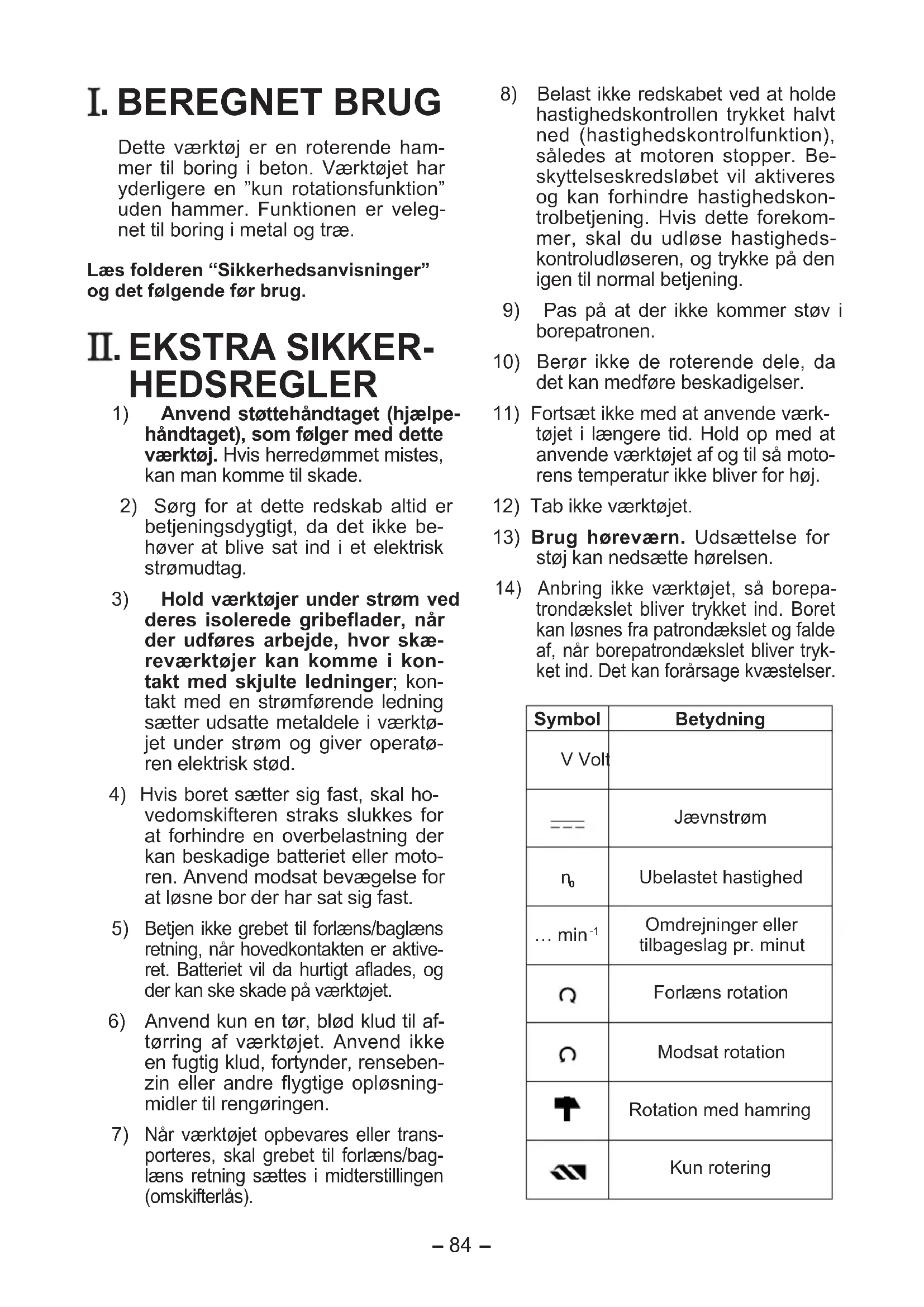 . BEREGNET BRUG Dette værktøj er en roterende ham- mer til boring i beton. Værktøjet har yderligere en ”kun rotationsfunktion” uden hammer. Funktionen er veleg- net til boring i metal og træ. Læs folderen “Sikkerhedsanvisninger” og det følgende før brug.