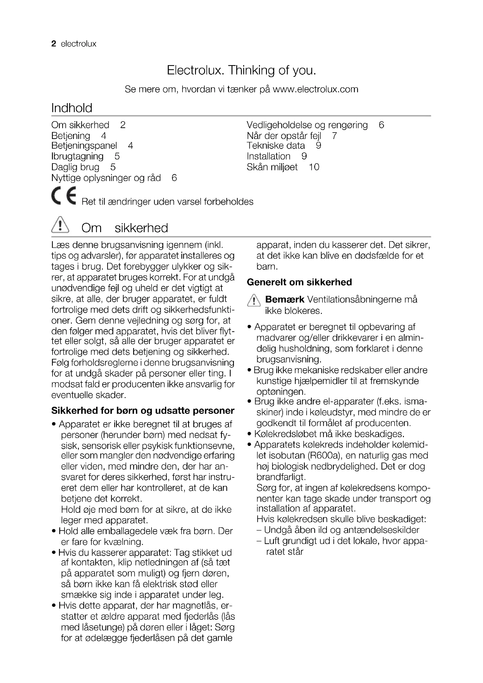 brugsanvisning benutzerinformation käyttöohje notice d'utilisation gebruiksaanwijzing bruksanvisning bruksanvisning Kummefryser Gefrierschrank Säiliöpakastin Congélateur Vrieskist Fryseboks Frysbox ECM26131WElectrolux. Thinking of you. Se mere om, hvordan vi tænker på www.electrolux.com Indhold Om sikkerhed 2 Betjening 4 Betjeningspanel 4 Ibrugtagning 5 Daglig brug 5 Nyttige oplysninger og råd 6 Vedligeholdelse og rengøring 6 Når der opstår fejl 7 Tekniske data 9 Installation 9 Skån miljøet 10 Ret til ændringer uden varsel forbeholdes Om sikkerhed Læs denne brugsanvisning igennem (inkl. tips og advarsler), før apparatet installeres og tages i brug. Det forebygger ulykker og sik- rer, at apparatet bruges korrekt. For at undgå unødvendige fejl og uheld er det vigtigt at sikre, at alle, der bruger apparatet, er fuldt fortrolige med dets drift og sikkerhedsfunkti- oner. Gem denne vejledning og sørg for, at den følger med apparatet, hvis det bliver flyt- tet eller solgt, så alle der bruger apparatet er fortrolige med dets betjening og sikkerhed. Følg forholdsreglerne i denne brugsanvisning for at undgå skader på personer eller ting. I modsat fald er producenten ikke ansvarlig for eventuelle skader. Sikkerhed for børn og udsatte personer