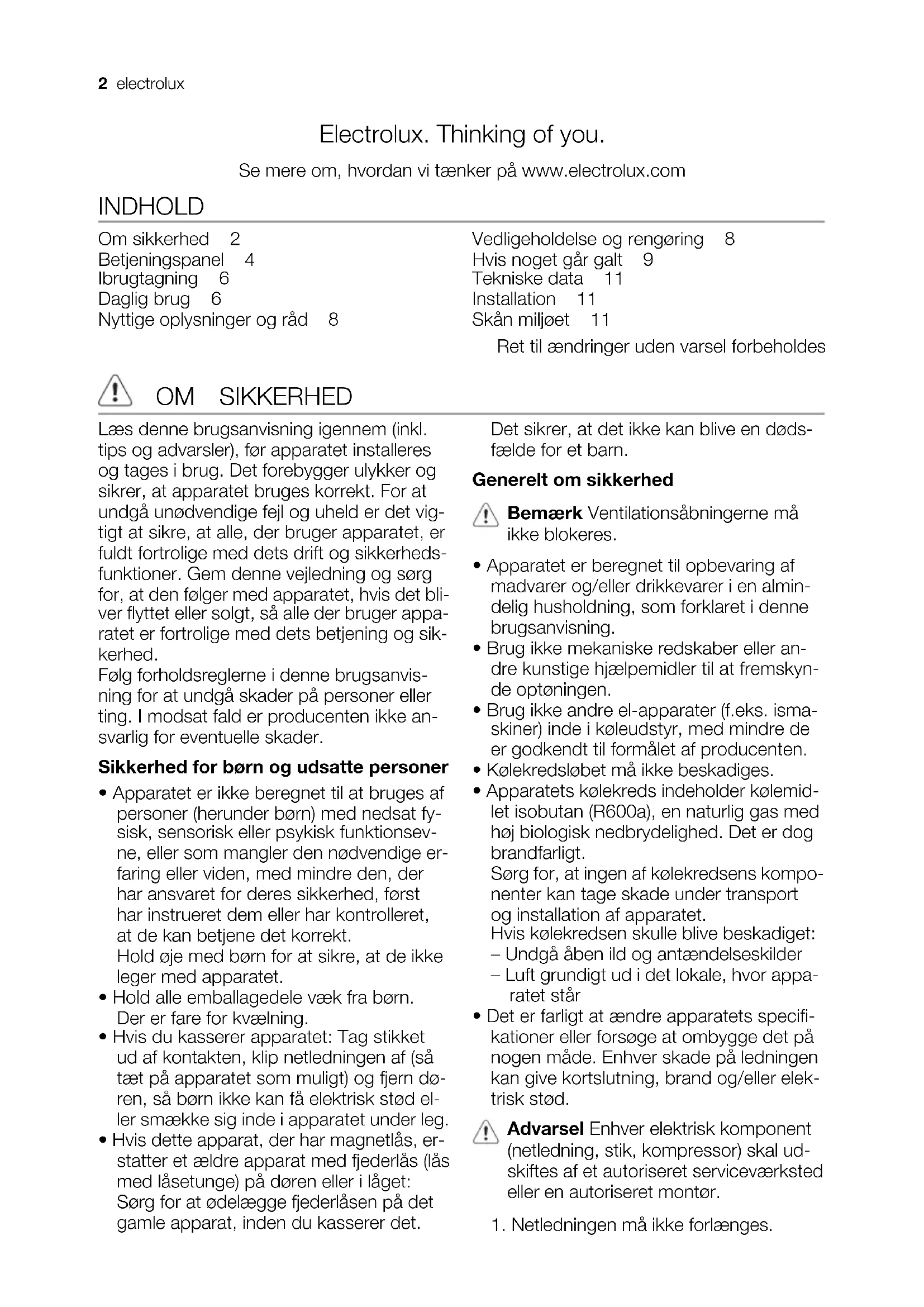 brugsanvisning gebruiksaanwijzing notice d'utilisation benutzerinformation manual de instruções bruksanvisning fryseboks Vrieskist Congélateur coffre Gefriertruhe Arca congeladora Frysbox ECF23461WElectrolux. Thinking of you. Se mere om, hvordan vi tænker på www.electrolux.com INDHOLD Om sikkerhed 2 Betjeningspanel 4 Ibrugtagning 6 Daglig brug 6 Nyttige oplysninger og råd 8 Vedligeholdelse og rengøring 8 Hvis noget går galt 9 Tekniske data 11 Installation 11 Skån miljøet 11 Ret til ændringer uden varsel forbeholdes OM SIKKERHED Læs denne brugsanvisning igennem (inkl. tips og advarsler), før apparatet installeres og tages i brug. Det forebygger ulykker og sikrer, at apparatet bruges korrekt. For at undgå unødvendige fejl og uheld er det vig- tigt at sikre, at alle, der bruger apparatet, er fuldt fortrolige med dets drift og sikkerheds- funktioner. Gem denne vejledning og sørg for, at den følger med apparatet, hvis det bli- ver flyttet eller solgt, så alle der bruger appa- ratet er fortrolige med dets betjening og sik- kerhed. Følg forholdsreglerne i denne brugsanvis- ning for at undgå skader på personer eller ting. I modsat fald er producenten ikke an- svarlig for eventuelle skader. Sikkerhed for børn og udsatte personer