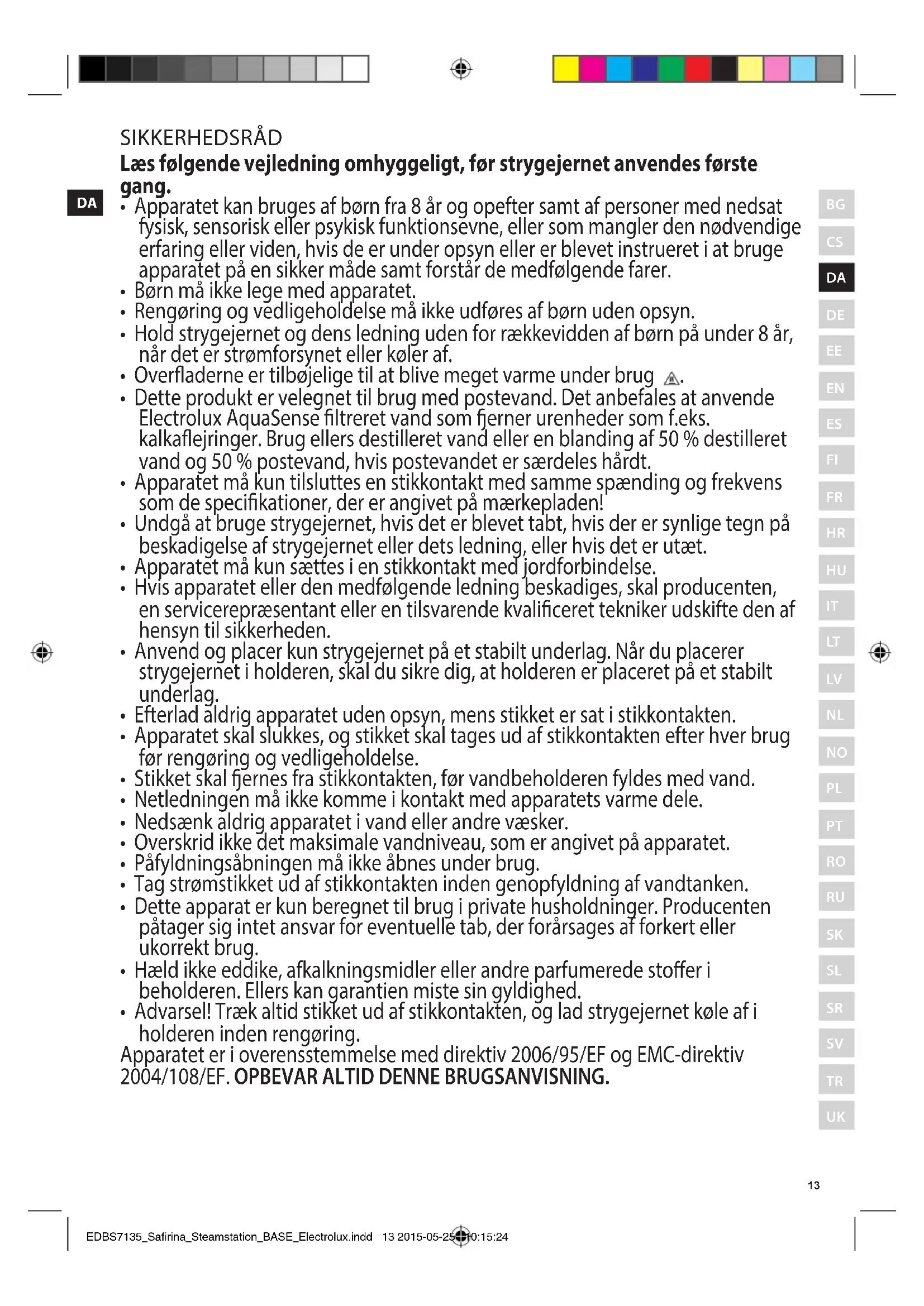 EDBS7135_Safirina_Steamstation_BASE_Electrolux.indd 12 2015-05-25 10:15:24DA SIKKERHEDSRÅD Læs følgende vejledning omhyggeligt, før strygejernet anvendes første gang.