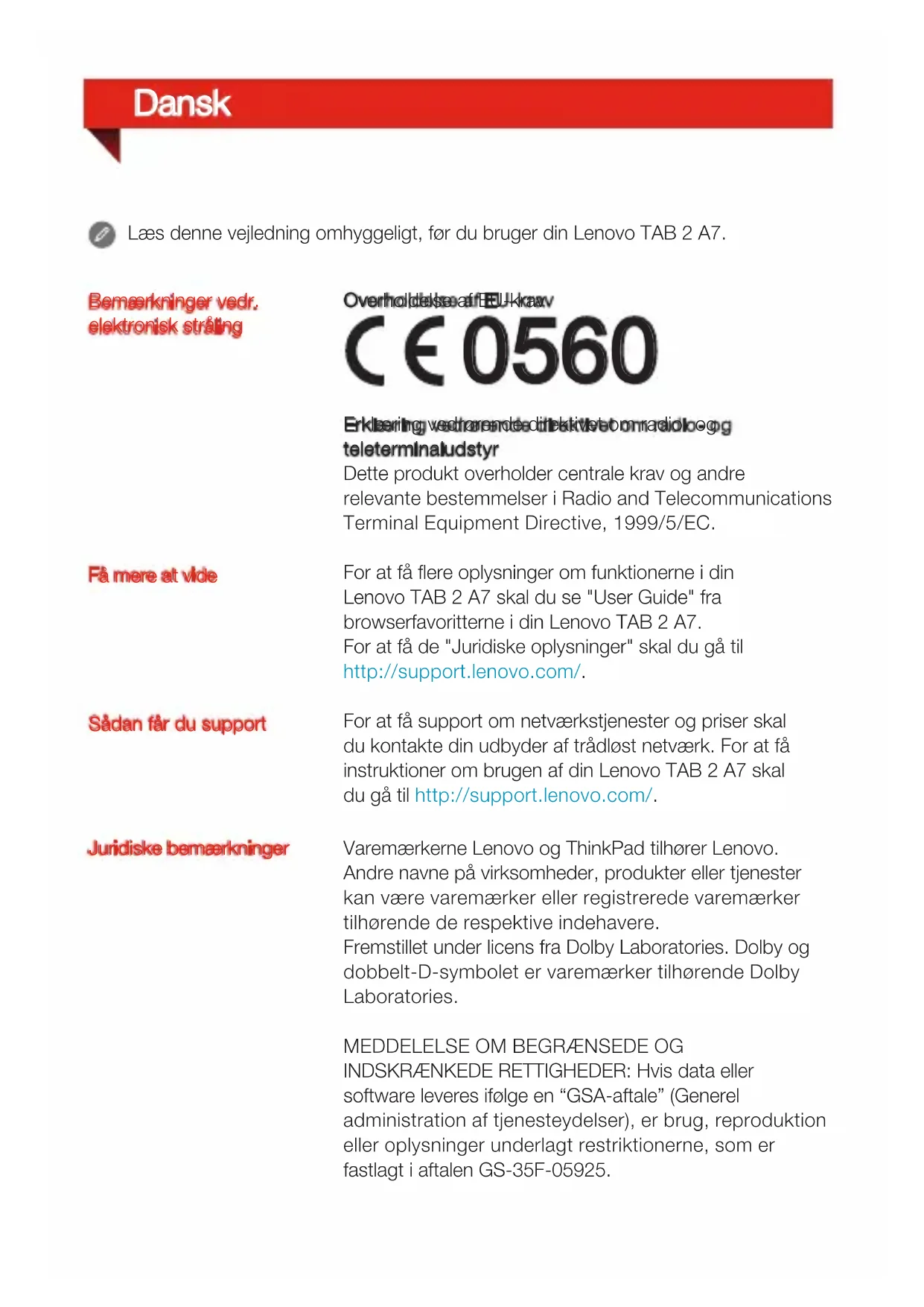 INDSKRÆNKEDE RETTIGHEDER: Hvis data eller software leveres ifølge en “GSA-aftale” (Generel administration af tjenesteydelser), er brug, reproduktion eller oplysninger underlagt restriktionerne, som er fastlagt i aftalen GS-35F-05925. For at få flere oplysninger om funktionerne i din Lenovo TAB 2 A7 skal du se "User Guide" fra browserfavoritterne i din Lenovo TAB 2 A7. For at få de "Juridiske oplysninger" skal du gå til http://support.lenovo.com/. Sådan får du support For at få support om netværkstjenester og priser skal du kontakte din udbyder af trådløst netværk. For at få instruktioner om brugen af din Lenovo TAB 2 A7 skal du gå til http://support.lenovo.com/. Læs denne vejledning omhyggeligt, før du bruger din Lenovo TAB 2 A7. Erklæring vedrørende direktivet om radio- og teleterminaludstyr Dette produkt overholder centrale krav og andre relevante bestemmelser i Radio and Telecommunications Terminal Equipment Directive, 1999/5/EC. Overholdelse af EU-krav 0560Tekniske specifikationer MT8127 3450 mAh Model og version Kamera Batteri Skærm Trådløs kommunikation 0,3M (forside) +