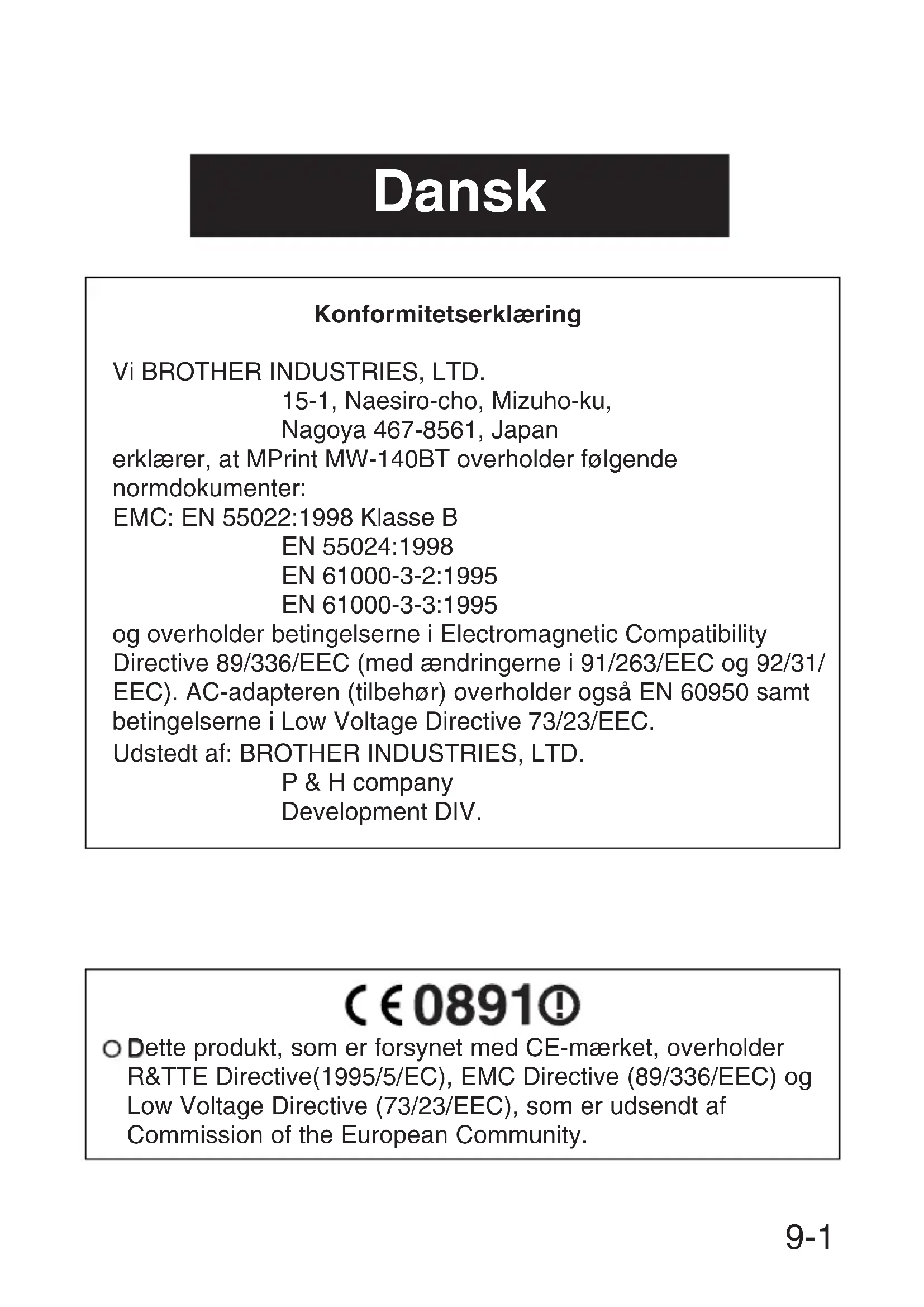Bemærk : Adobe acrobat Reader er nødvendig for at man kan se brugsanvisningen og softwarevejledningen. Printerspecifikationer Produktspecifikationer IndikatorerStatusindikatorlampe (blå/grøn/rød)Opladningsindikatorlampe (orange)UdskrivningMetodeDirekte termisk udskrivning med et lineærtprinthovedOpløsning 300 dpi ✕ 300 dpiUdskrivningshastighed15 sekunder/ark(standardtekst på termisk papir med 7% dækningved en omgivelsestemperatur på 25 ˚C)Antal sider,der kanudskrives100 eller mere ved kontinuerlig print med et fuldt opladet batteri. Brug af sleep mode kan have indvirkning på dette. (Baseret på 7% dkning ved enambient temperatur på 25 grader Celcius) (Standard papir produceret af Brother: A7 Thermal)PapirforsyningsmetodeBrother papirkassette, automatisk papirfremføringsmekanismePapir Brother A7 papirark (74 mm ✕ 105 mm)StrømforsyningKompakt AC-adapter til opladning, litium-ionbatteri (indbygget) 780 mAh (7,4 V)GrænsefladeOverholder USB Ver. 1.1 og overholderBluetooth ver. 1.1 klasse 2 seriel port-profilDimensioner100 mm (B) 160 mm (inkluderer ikke projektion) (D) 17,5 mm (H) Vægt 300 g (inkl. det indbyggede litium-ion-batteriog en papirkassette, der indeholder 50 arkalmindeligt termisk papir) MW-140BT Tilbehør Varenr. BeskrivelseC-11 A7 Termisk papir (105 mm ✕ 74 mm)C-21 A7 Etiket (105 mm ✕ 74 mm)C-41 A7 Etiketark (4/ark) (26,25 mm ✕ 74 mm)C-42 A7 Etiketark (2/ark) (52,5 mm ✕ 74 mm)Antal: 50 ark/kassette (termisk papir)30 ark/kassette (alt andet) 9-69-5MW-140BT Quick Guide cover MW-140BT Mobile Printer Quick Guide Guide de référence rapide Installationsanleitung Guida rapida Guía rápida Snelstartgids Hurtigveiledning Snabbhandledning Kvikguide