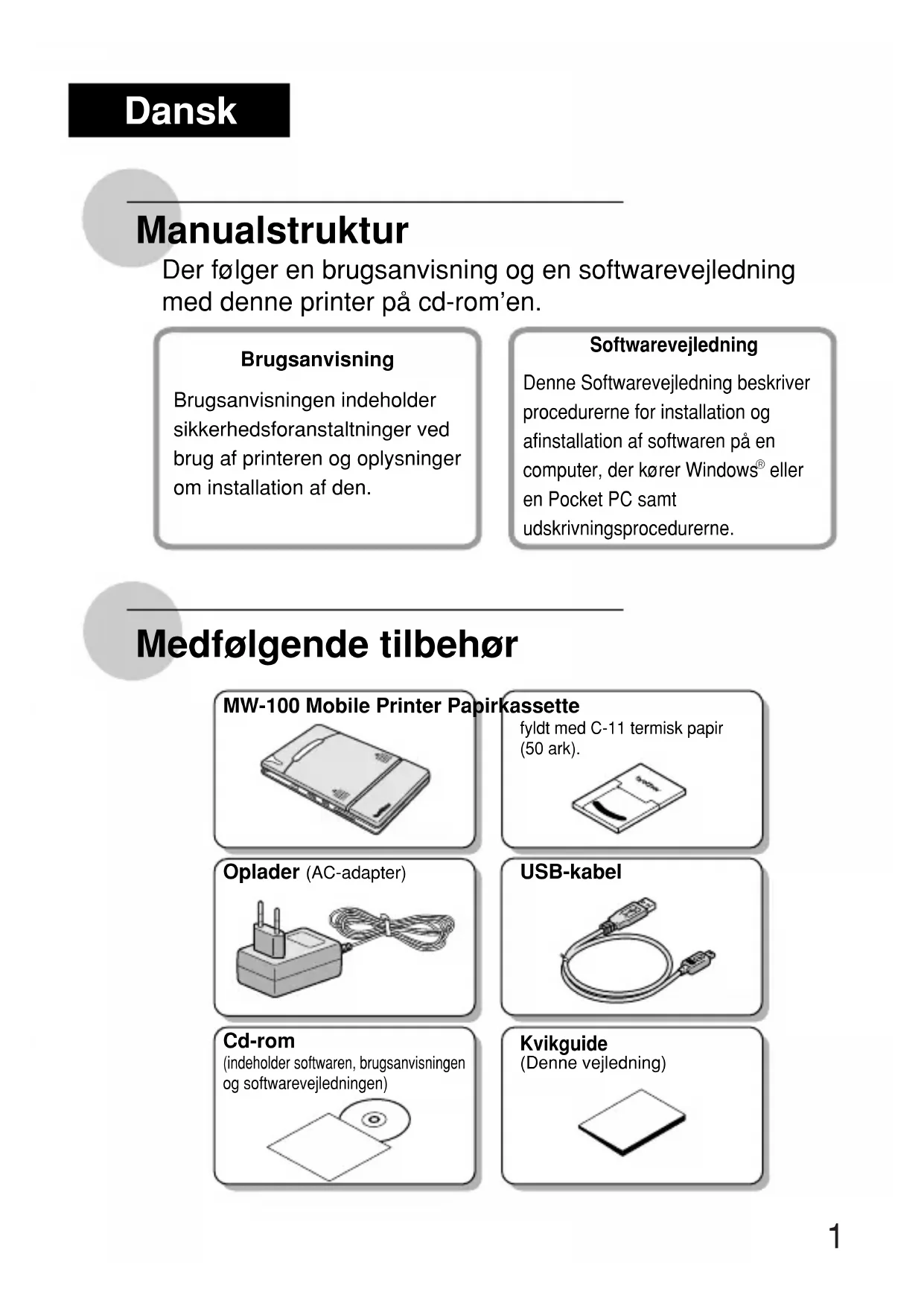 eller en Pocket PC samt udskrivningsprocedurerne. MW-100 Mobile Printer Papirkassette fyldt med C-11 termisk papir (50 ark). Oplader (AC-adapter) Cd-rom (indeholder softwaren, brugsanvisningen og softwarevejledningen) Kvikguide (Denne vejledning) USB-kabel Dansk 1Printerbetjening Læs denne Kvikguide, og kontroller, at alt tilbehør er med. Sæt den medfølgende cd i cd-rom-drevet i computeren under Windows