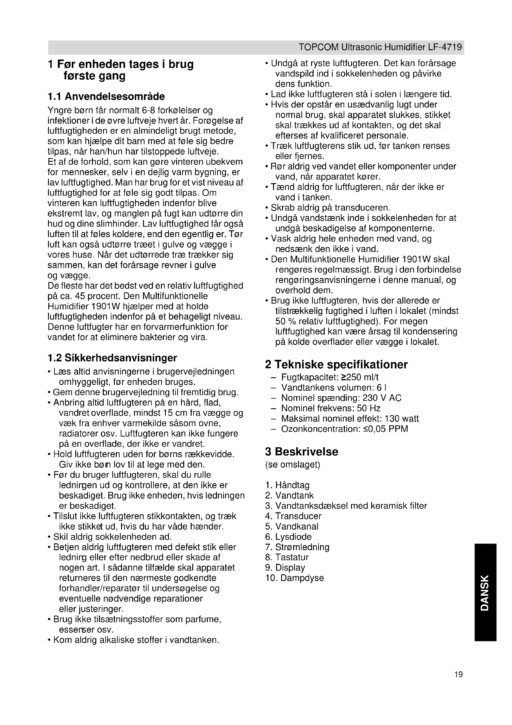 n19 DANSK TOPCOM Ultrasonic Humidifier LF-4719 1 Før enheden tages i brug første gang