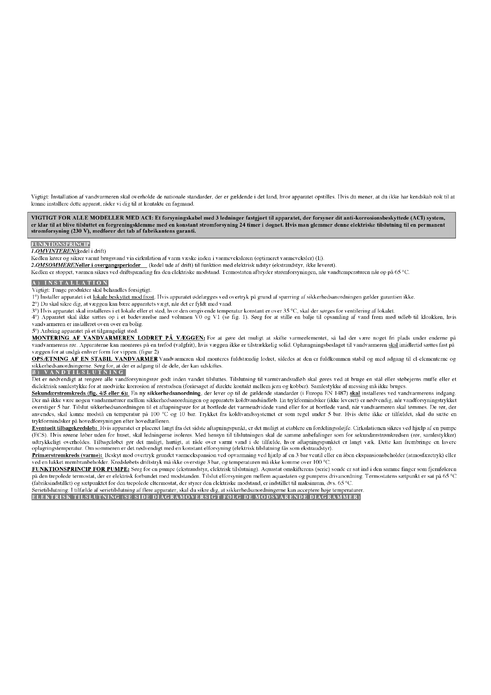 Der kræves intet supplerende indgreb (de interne tilslutninger er allerede udført). Et forsyningskabel med 3 ledninger fastgjort til apparatet er klar til at blive tilsluttet en forgreningsklemme med en permanent strømforsyning 24 timer i døgnet. Efter at have tændt for apparatet kontrolleres at den grønne kontrollampe for ACI blinker senest 15 minutter efter.VEDLIGEHOLDELSE Privat vedligeholdelse: Betjen vandsikkerhedssystemets tømningsanordning en gang om måneden. Hvis denne vedligeholdelse ikke overholdes kan det medføre skade og tab af garantien. For installation udstyret med pumpe, inden genstart, som følge af et længerevarende stop, få rotoren til at køre under hensyn til fabrikantens vejledninger. Vedligeholdelse ved en fagkyndig: a) Fjern kedelstenen, der har sat sig som slam. Kedelstenen, der hænger fast på væggen, må hverken skrabes eller slås, eftersom man risikerer at beskadige beklædningen. b) Apparat med magnesiumanode skal udskiftes hvert andet år eller straks når dens diameter er mindre end 10 mm. Udskiftning af et afskærmet varmeelement eller en anode kræver tømning af vandvarmeren og udskiftning af pakningen. Afbryd elforsyningen og det kolde vand og åbn varmtvandshanerne, inden handlingen udføres. Sæt varmeelementet på plads ved at stramme møtrikkerne (kryds), kontroller tætheden dagen efter og stram igen hvis nødvendigt. UDSKIFTELIGE DELE: Termostaten, pakningerne, varmeelementet, varmelegemet, kontrollampen, magnesiumanoden, ACI-platin, tilslutningskablet. Garantien er betinget af, at fabrikantens originale dele bruges. RÅD TIL BRUGEREN. Hvis vandet har en hårdhedsgrad > 20°dH, anbefales det at behandle den. Hvis der bruges et blødgøringsfilter, skal vandets hårdhedsgrad forblive over 15°dH. For overgangen mellem vinter og sommer skal de beskrevne angivelser overholdes opstrøms, dvs. ved at afbryde den primære væskecirkulation via lukning af ventilen, der sidder på kredsløbet. Kørsel om vinteren kræver afbrydelse af strømforsyningen til modstanden (hvis du har elektrisk tilslutning). I tilfælde af en længerevarende pause og især om vinteren skal apparatet tømmes ved at følge denne fremgangsmåde.