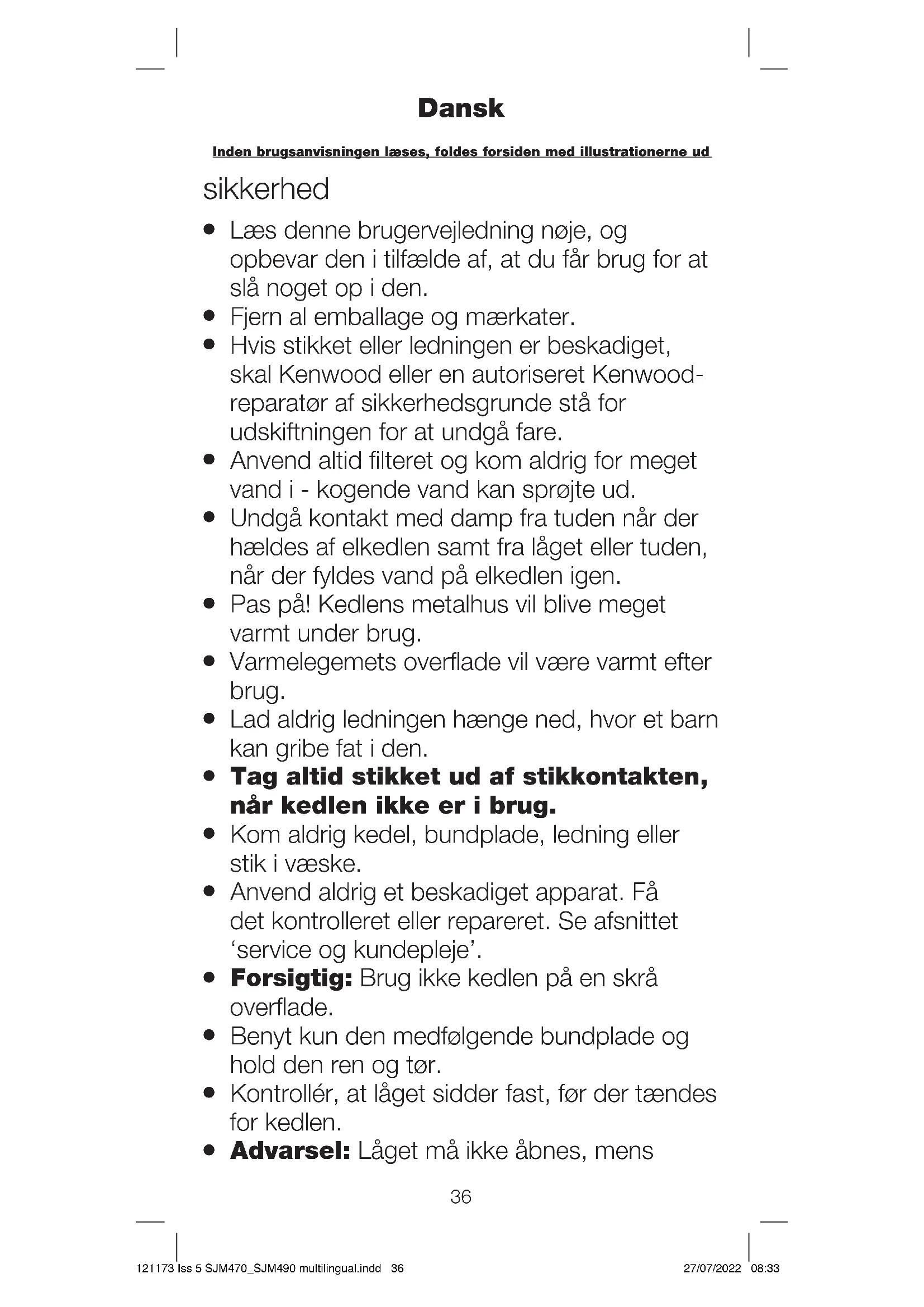 Advarsel: Låget må ikke åbnes, mens Dansk Inden brugsanvisningen læses, foldes forsiden med illustrationerne ud 121173 Iss 5 SJM470_SJM490 multilingual.indd 36121173 Iss 5 SJM470_SJM490 multilingual.indd 36 27/07/2022 08:3327/07/2022 08:3337 vandet er i kog.