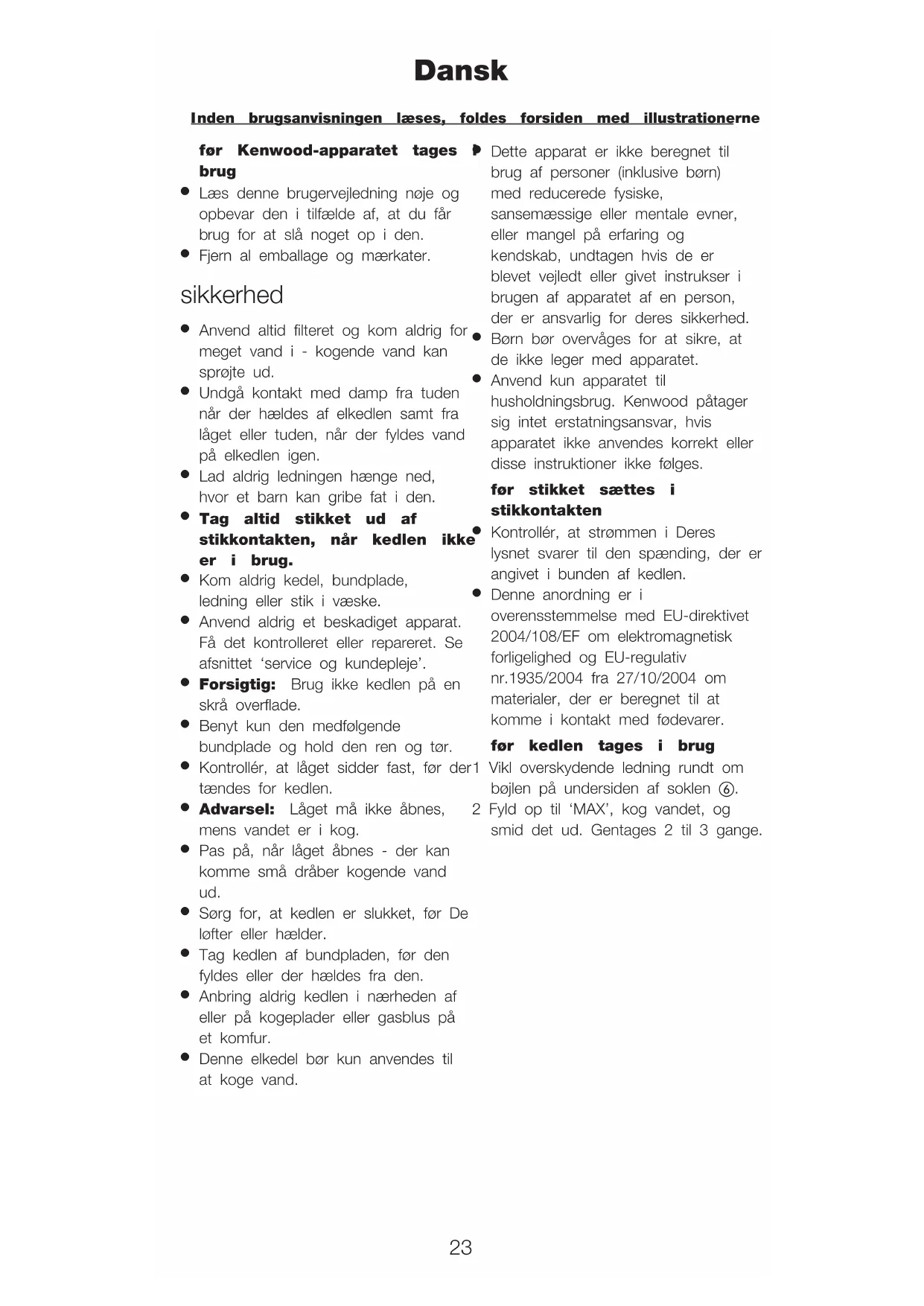 Anvend kun apparatet til husholdningsbrug. Kenwood påtager sig intet erstatningsansvar, hvis apparatet ikke anvendes korrekt eller disse instruktioner ikke følges. før stikket sættes i stikkontakten