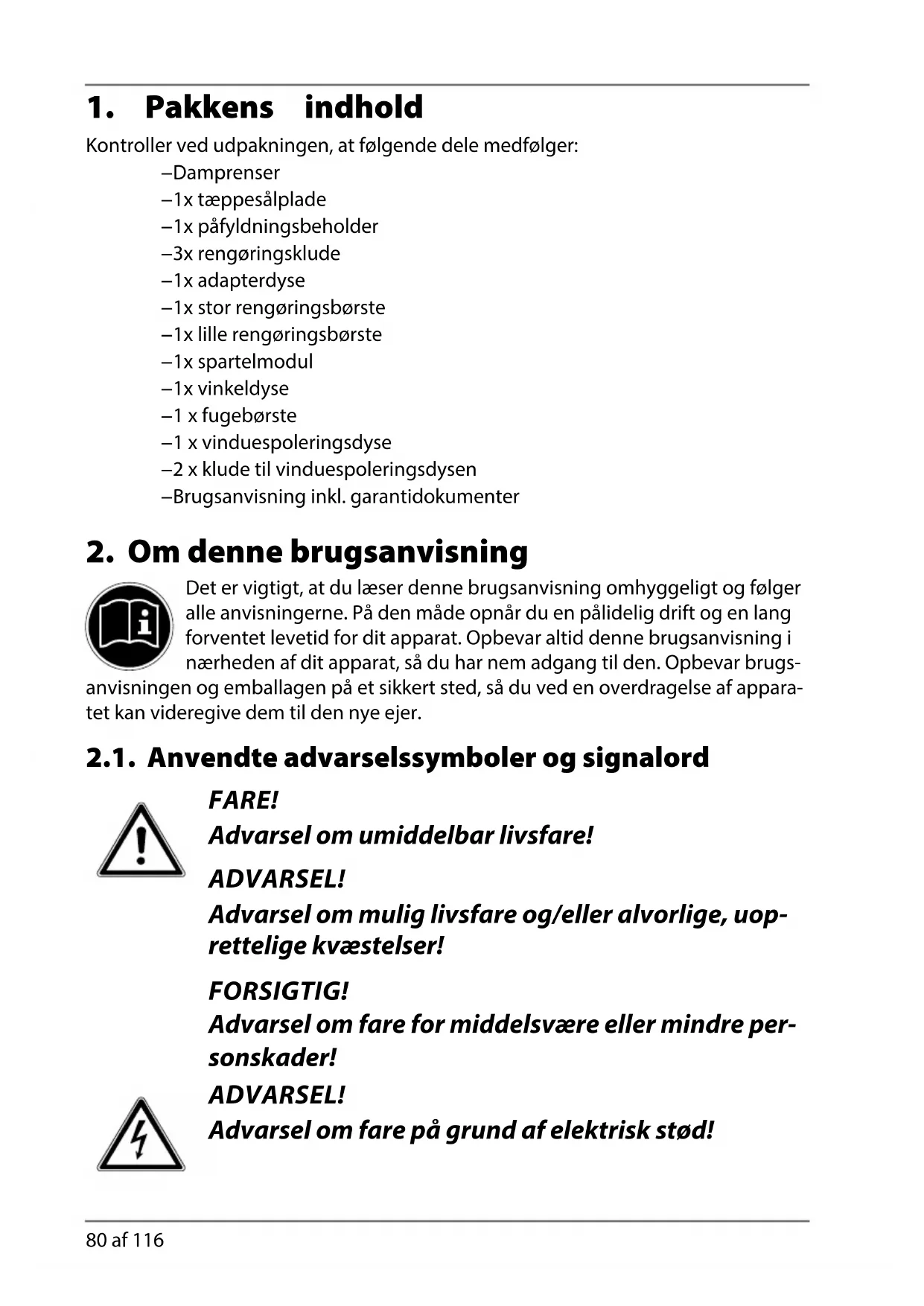 Det er vigtigt, at du læser denne brugsanvisning omhyggeligt og følger alle anvisningerne. På den måde opnår du en pålidelig drift og en lang forventet levetid for dit apparat. Opbevar altid denne brugsanvisning i nærheden af dit apparat, så du har nem adgang til den. Opbevar brugs- anvisningen og emballagen på et sikkert sted, så du ved en overdragelse af appara- tet kan videregive dem til den nye ejer. 2.1. Anvendte advarselssymboler og signalord FARE! Advarsel om umiddelbar livsfare! ADVARSEL! Advarsel om mulig livsfare og/eller alvorlige, uop- rettelige kvæstelser! FORSIGTIG! Advarsel om fare for middelsvære eller mindre per- sonskader! ADVARSEL! Advarsel om fare på grund af elektrisk stød! 15857 eCommerce Content RC1.indb 8015857 eCommerce Content RC1.indb 80 04.05.2015 09:58:3604.05.2015 09:58:3681 af 116