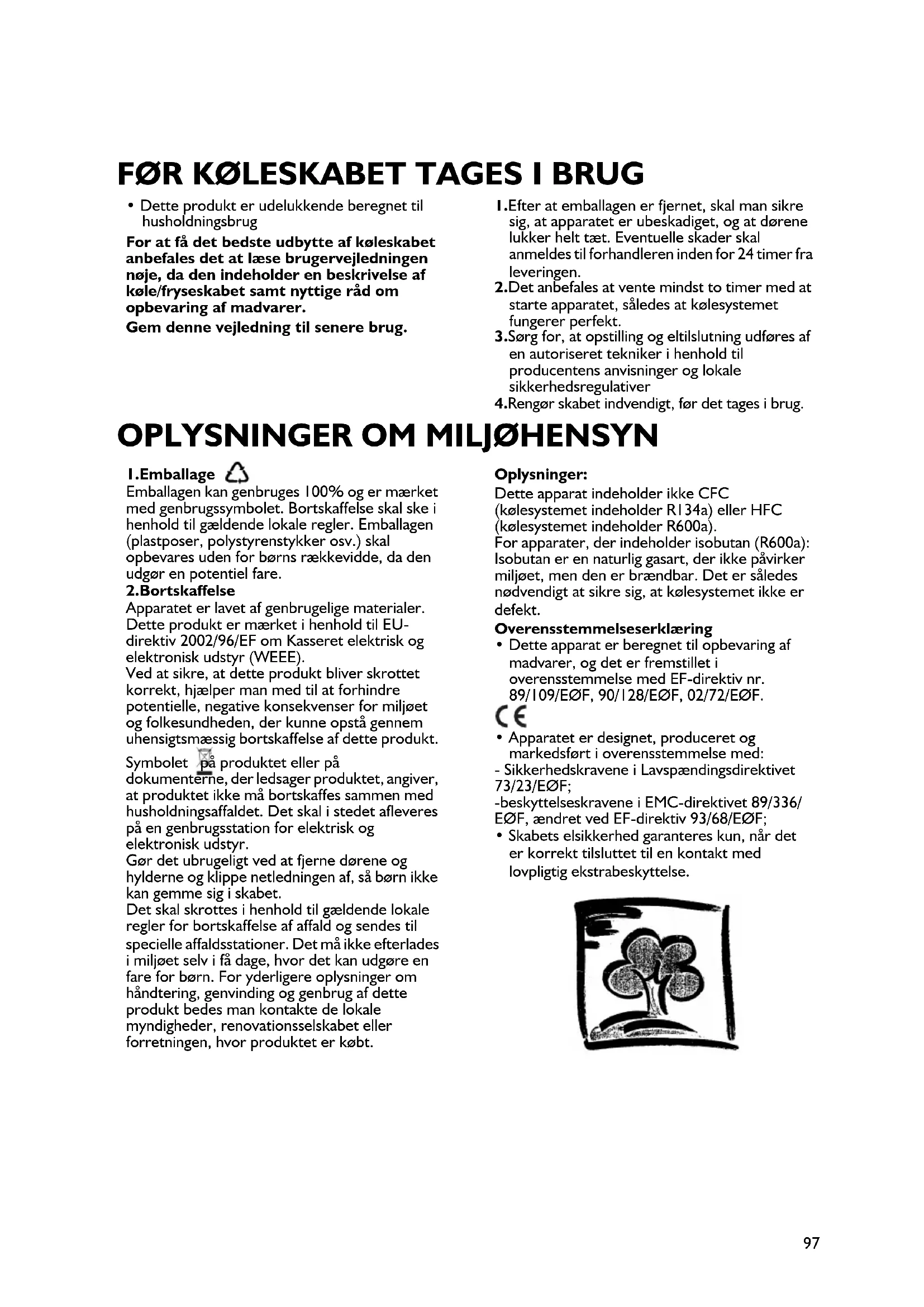 - Dette produkt er udelukkende beregnet til husholdningsbrug For at få det bedste udbytte af køleskabet anbefales det at læse brugervejledningen nøje, da den indeholder en beskrivelse af køle/fryseskabet samt nyttige råd om opbevaring af madvarer. Gem denne vejledning til senere brug. 1.Efter at emballagen er fjernet, skal man sikre sig, at apparatet er ubeskadiget, og at dørene lukker helt tæt. Eventuelle skader skal anmeldes til forhandleren inden for 24 timer fra leveringen. 2.Det anbefales at vente mindst to timer med at starte apparatet, således at kølesystemet fungerer perfekt. 3.Sørg for, at opstilling og eltilslutning udføres af en autoriseret tekniker i henhold til producentens anvisninger og lokale sikkerhedsregulativer 4.Rengør skabet indvendigt, før det tages i brug. 1.Emballage Emballagen kan genbruges 100% og er mærket med genbrugssymbolet. Bortskaffelse skal ske i henhold til gældende lokale regler. Emballagen (plastposer, polystyrenstykker osv.) skal opbevares uden for børns rækkevidde, da den udgør en potentiel fare. 2.Bortskaffelse Apparatet er lavet af genbrugelige materialer. Dette produkt er mærket i henhold til EU- direktiv 2002/96/EF om Kasseret elektrisk og elektronisk udstyr (WEEE). Ved at sikre, at dette produkt bliver skrottet korrekt, hjælper man med til at forhindre potentielle, negative konsekvenser for miljøet og folkesundheden, der kunne opstå gennem uhensigtsmæssig bortskaffelse af dette produkt. Symbolet på produktet eller på dokumenterne, der ledsager produktet, angiver, at produktet ikke må bortskaffes sammen med husholdningsaffaldet. Det skal i stedet afleveres på en genbrugsstation for elektrisk og elektronisk udstyr. Gør det ubrugeligt ved at fjerne dørene og hylderne og klippe netledningen af, så børn ikke kan gemme sig i skabet. Det skal skrottes i henhold til gældende lokale regler for bortskaffelse af affald og sendes til specielle affaldsstationer. Det må ikke efterlades i miljøet selv i få dage, hvor det kan udgøre en fare for børn. For yderligere oplysninger om håndtering, genvinding og genbrug af dette produkt bedes man kontakte de lokale myndigheder, renovationsselskabet eller forretningen, hvor produktet er købt. Oplysninger: Dette apparat indeholder ikke CFC (kølesystemet indeholder R134a) eller HFC (kølesystemet indeholder R600a). For apparater, der indeholder isobutan (R600a): Isobutan er en naturlig gasart, der ikke påvirker miljøet, men den er brændbar. Det er således nødvendigt at sikre sig, at kølesystemet ikke er defekt. Overensstemmelseserklæring