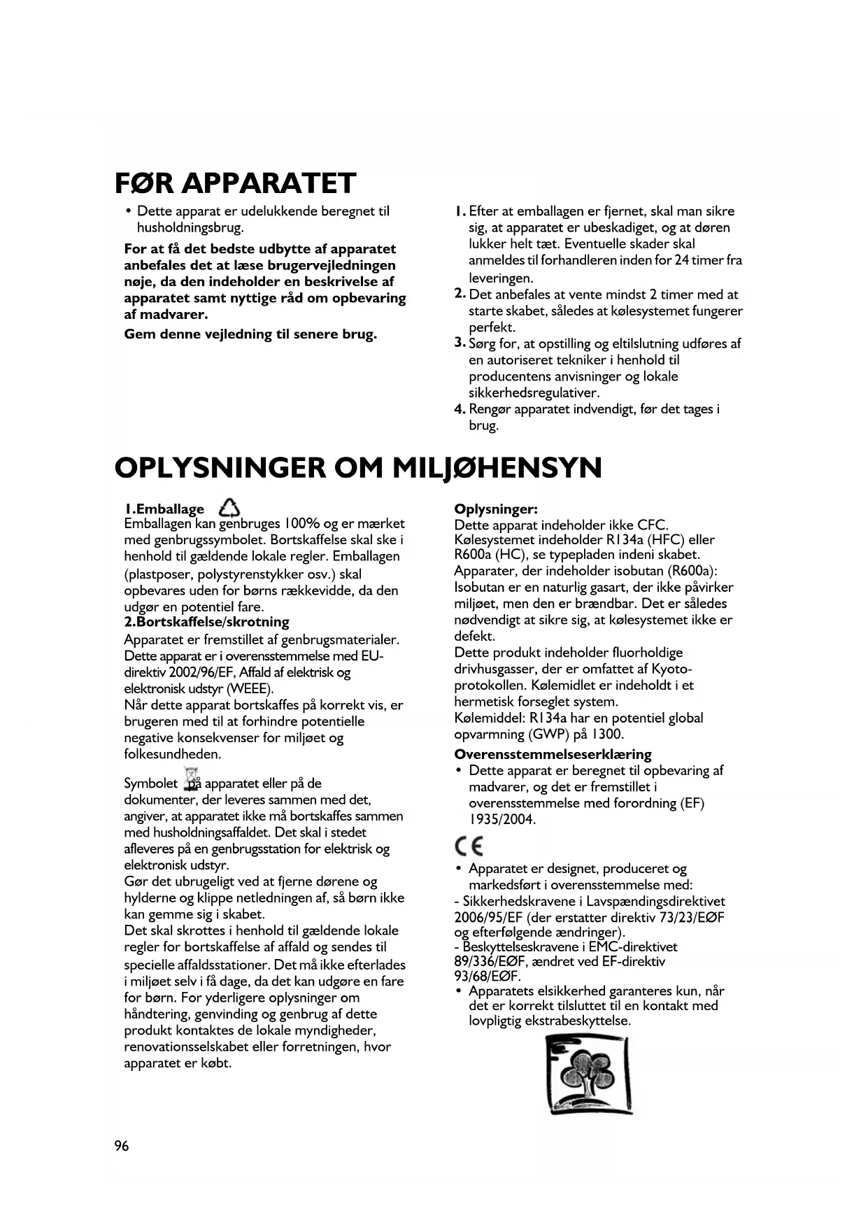 Rengør apparatet indvendigt, før det tages i brug. 1.Emballage Emballagen kan genbruges 100% og er mærket med genbrugssymbolet. Bortskaffelse skal ske i henhold til gældende lokale regler. Emballagen (plastposer, polystyrenstykker osv.) skal opbevares uden for børns rækkevidde, da den udgør en potentiel fare. 2.Bortskaffelse/skrotning Apparatet er fremstillet af genbrugsmaterialer. Dette apparat er i overensstemmelse med EU- direktiv 2002/96/EF, Affald af elektrisk og elektronisk udstyr (WEEE). Når dette apparat bortskaffes på korrekt vis, er brugeren med til at forhindre potentielle negative konsekvenser for miljøet og folkesundheden. Symbolet på apparatet eller på de dokumenter, der leveres sammen med det, angiver, at apparatet ikke må bortskaffes sammen med husholdningsaffaldet. Det skal i stedet afleveres på en genbrugsstation for elektrisk og elektronisk udstyr. Gør det ubrugeligt ved at fjerne dørene og hylderne og klippe netledningen af, så børn ikke kan gemme sig i skabet. Det skal skrottes i henhold til gældende lokale regler for bortskaffelse af affald og sendes til specielle affaldsstationer. Det må ikke efterlades i miljøet selv i få dage, da det kan udgøre en fare for børn. For yderligere oplysninger om håndtering, genvinding og genbrug af dette produkt kontaktes de lokale myndigheder, renovationsselskabet eller forretningen, hvor apparatet er købt. Oplysninger: Dette apparat indeholder ikke CFC. Kølesystemet indeholder R134a (HFC) eller R600a (HC), se typepladen indeni skabet. Apparater, der indeholder isobutan (R600a): Isobutan er en naturlig gasart, der ikke påvirker miljøet, men den er brændbar. Det er således nødvendigt at sikre sig, at kølesystemet ikke er defekt. Dette produkt indeholder fluorholdige drivhusgasser, der er omfattet af Kyoto- protokollen. Kølemidlet er indeholdt i et hermetisk forseglet system. Kølemiddel: R134a har en potentiel global opvarmning (GWP) på 1300. Overensstemmelseserklæring