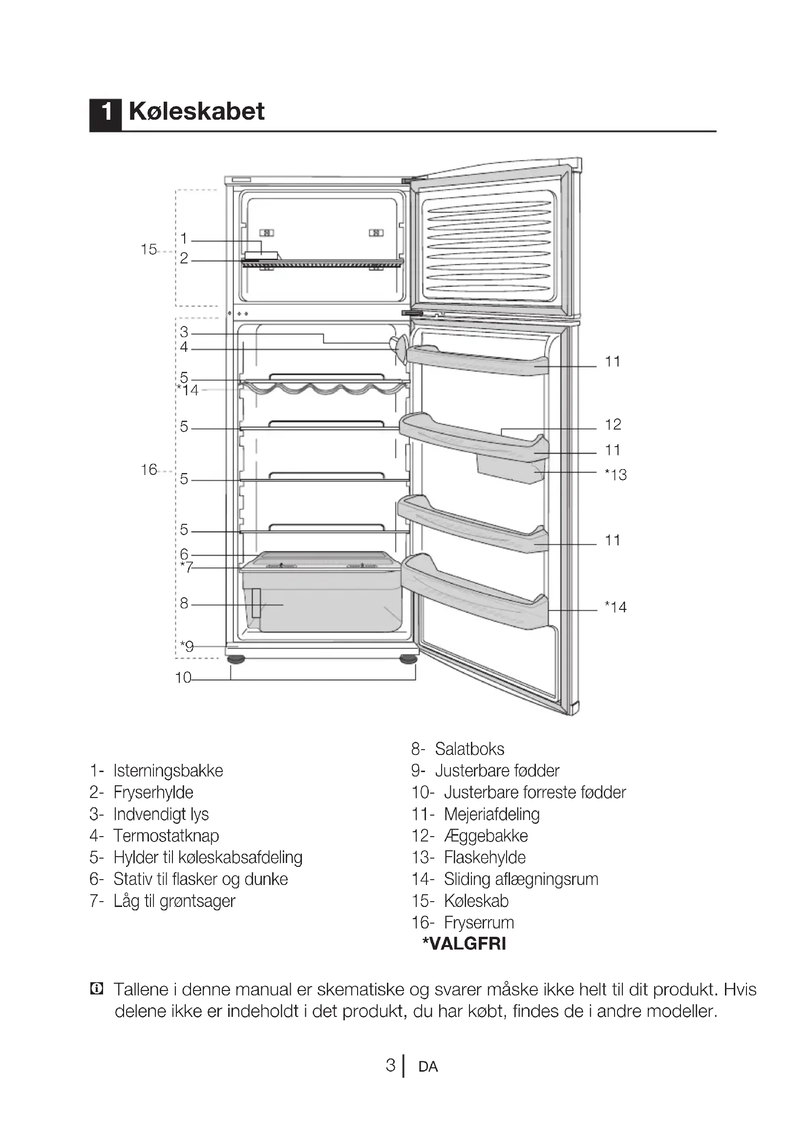 C Tallene i denne manual er skematiske og svarer måske ikke helt til dit produkt. Hvis delene ikke er indeholdt i det produkt, du har købt, findes de i andre modeller. 1 Køleskabet