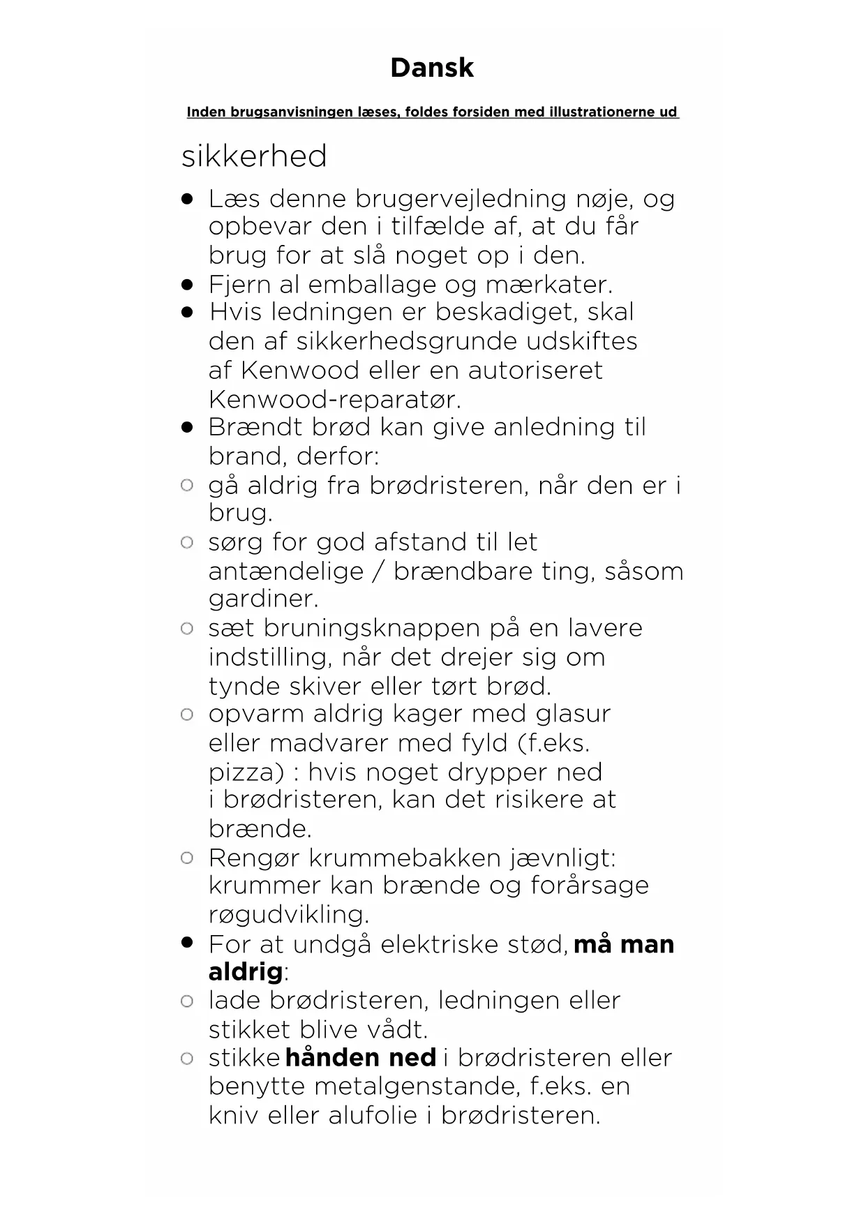 ELEKTRONISK UDSTYR (WEEE) Ved afslutningen af dets produktive liv må produktet ikke bortskaffes som almindeligt affald. Det bør afleveres på et specialiseret lokalt genbrugscenter eller til en67 68 fejlsøgningsguide Problem Årsag Løsning Brødrister virker ikke. Ingen strøm. Kontrollér, at brødristerens stik er sat i. Kontrollér sikringen/ strømafbryderen i hjemmet. Håndtaget bliver ikke nede Risterens stik ikke sat i. Håndtaget bliver ikke nede, medmindre brødristerens stik er sat i. Ujævn brun farve. 1 Brødskive ristes. Brødskiver af forskellig størrelse, friskhed eller tykkelse ristes på samme tid. For de bedste resultater skal det sikres, at brødskiverne har samme tykkelse, friskhed og størrelse. For at få ensartet brun farve anbefaler vi, at du venter minimum 30 sekunder mellem hver ristning, så knappen automatisk kan nulstilles. Vælg alternativt en lavere indstilling under yderligere ristning. Brødets farve for lys eller for mørk. Forkert bruningsindstilling anvendt. Vælg en højere eller lavere bruningsindstilling. Se afsnittet med tips. Brændt lugt eller røg fra åbninger. Krummebakke fuld. Madpartikler sidder fast på element eller løst i risteåbninger. Tag stikket ud, før åbningerne kontrolleres. Fjern alle løse madpartikler. Udtag og rengør krummebakken. Hvis ovenstående ikke er relevant, henvises til ”Service og kundepleje”. forhandler, der yder denne service. At bortskaffe et elektrisk husholdningsapparat separat gør det muligt at undgå eventuelle negative konsekvenser for miljø og helbred på grund af uhensigtsmæssig bortskaffelse, og det giver mulighed for at genbruge de materialer det består af, og dermed opnå en betydelig energi- og ressourcebesparelse. Som en påmindelse om nødvendigheden af at bortskaffe elektriske husholdningsapparater separat, er produktet mærket med en mobil affaldsbeholder med et kryds.69 70 Svenska Vik ut framsidan med illustrationerna innan du börjar läsa säkerhet
