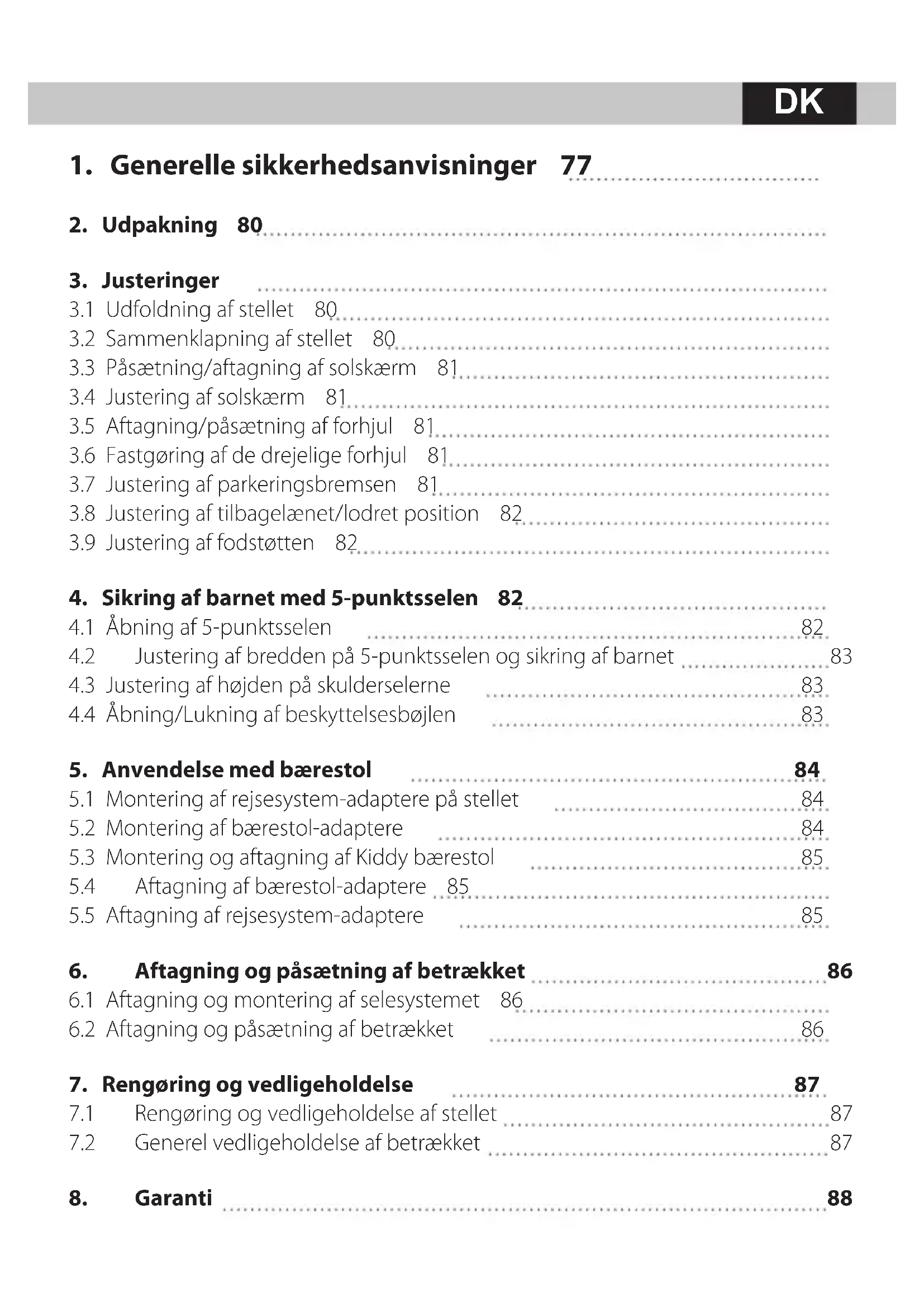 ADVARSEL Læs venligst denne brugsanvisning nøje igennem inden ibrug- tagning, og gem den til fremtidig brug. Du kan sætte dit barns sikkerhed på spil, hvis du ikke følger anvisningerne. ADVARSEL Det kan være farligt at efterlade dit barn uden opsyn i klapvognen. ADVARSEL Sørg for, at alle låsemekanismer er aktiverede inden ibrug- tagning. ADVARSEL Sædet er ikke egnet til børn under 6 måneder. ADVARSEL Overbelast ikke kurven, solskærmens lomme eller kopholderen. Maksimum vægt for kurven er 5 kg, solskærmens lomme 0,2 kg og kopholderen 0,5 kg. Overbelastning kan forårsage instabilitet af klapvognen! ADVARSEL Brug ikke klapvognen med flere end ét barn ad gangen. ADVARSEL Der må kun anvendes reservedele og tilbehør, som er godkendt af fabrikanten. ADVARSEL Brug en sele, så snart dit barn kan sidde uden støtte i klapvognen. ADVARSEL Brug altid skridtselen sammen med hofteselen. Der findes påsætningspunkter (D-ringe) for en separat sele på de ydre ender af skridtselen. ADVARSEL Kontroller, at klapvognskassen eller sædet er spændt rigtigt fast inden ibrugtagning. ADVARSEL Dette produkt er ikke egnet til at løbe eller skøjte med.DK