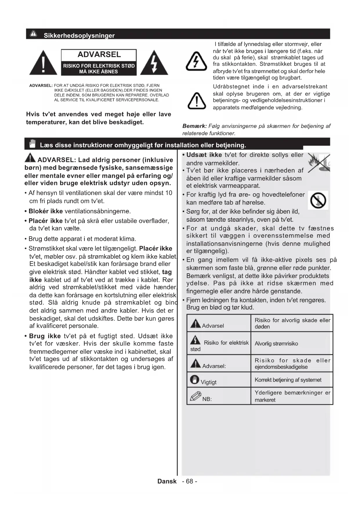 - Fjern ledningen fra kontakten, inden tv'et rengøres. Brug en blød og tør klud. Advarsel Risiko for alvorlig skade eller døden Risiko for elektrisk stød Alvorlig strømrisiko Advarsel: Risiko for skade eller ejendomsbeskadigelse Vigtigt Korrekt betjening af systemet NB: Yderligere bemærkninger er markeret I tilfælde af lynnedslag eller stormvejr, eller når tv'et ikke bruges i længere tid (f.eks. når du skal på ferie), skal strømkablet tages ud fra stikkontakten. Strømstikket bruges til at afbryde tv'et fra strømnettet og skal derfor hele tiden være tilgængeligt og brugbart. Udråbstegnet inde i en advarselstrekant skal oplyse brugeren om, at der er vigtige betjenings- og vedligeholdelsesinstruktioner i apparatets medfølgende vejledning. Læs disse instruktioner omhyggeligt før installation eller betjening. Bemærk: Følg anvisningerne på skærmen for betjening af relaterede funktioner. Hvis tv'et anvendes ved meget høje eller lave temperaturer, kan det blive beskadiget. ADVARSEL