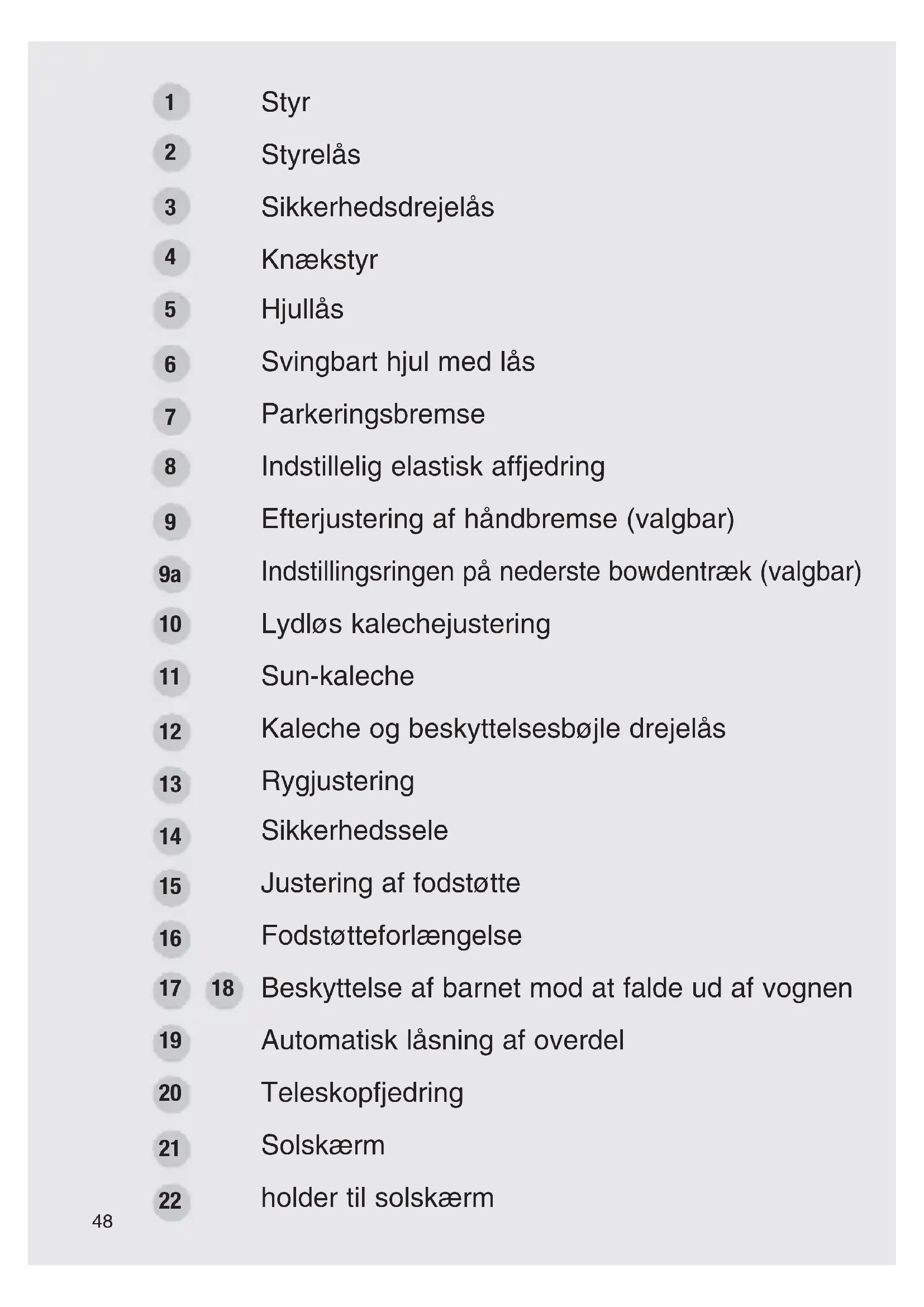 Rust: Stellet er behandlet mod rust for at give det en ordentlig grundbeskyttelse. Der vil dog kunne opstå rustpletter ved manglende vedligeholdelse. Der overtages ingen garanti for dem. Ridser: Ridser er normal slitage og er derfor ikke omfattet af garantien. Skimmeldannelse: Tekstiler, som er blevet fugtige, skal tørre rigtigt for at undgå dannelse af skimmel (se brugsanvisning). Der overtages intet ansvar for skimmeldannelse. Falmning af stoffer: Vi bekræfter, at stofferne er i overensstemmelse med gældende normer. Pga. sollys, sved, rengøringsmidler, slid (især på de steder, hvor der bribes fat i stoffet) eller for hyppig vask kan falmning ikke udelukkes og er således ingen reklamationsgrund. Ringe farvedifferencer mellem forskellige produktionspartier kan desværre ikke altid undgås og er ikke omfattet af garantien. Noppedannelse på stofferne: Noppedannelse er ikke omfattet af garantien. Det falder ind under almindelig pleje af tøj og kan ligesom ved uldtrøjer ganske enkelt fjernes med en klædebørste eller en noppemaskine. Revner i søm/ved trykknapper/i stoffet: Kontrollér omhyggeligt ved købet at alle stofdele, søm og trykknapper er syet og fastgjort korrekt. Eventuelle reklamationer af søm/defekte trykknapper skal efter konstatering af fejlen omgående videregives til forhandleren. Hjul: Barnevognshjul afbalanceres ikke og kan derfor have et let slag ("slå"). Nedslidte hjul er naturlig slitage. Punkteringer i lufthjul kan kun skyldes ydre påvirkning, spidse genstande eller kørsel med for lavt lufttryk og er ikke omfattet af garantien.
