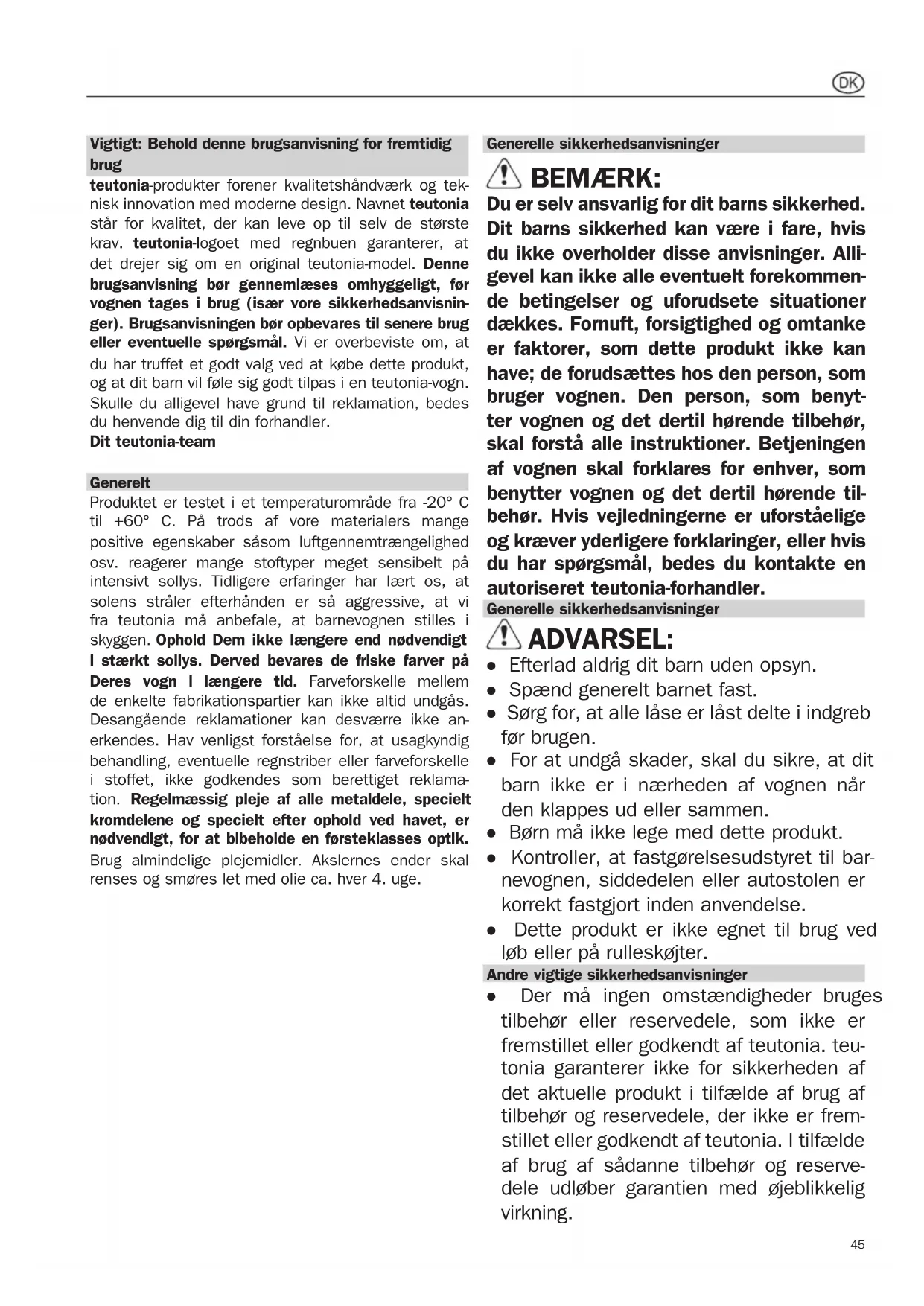 Attentie: om de stoelhoes terug te plaatsen moeten de knopgatten in de rugleuning samen vallen met de opening in de rugleuning van het kinderstoeltje. Hierbij moet u erop letten dat de riemen niet ver- draaien. De hoes van de armsteun verwijderen en bevestigen Ga in de omgekeerde richting te werk om de hoes van de armsteun te bevestigen. Reinigen van de stoffen onderdelen Neem voor kleineren vlekken een vochtige doek en schoon water en maak voorzichtig de betreffende plek schoon. Wrijf niet te hard (in het bijzonder bij donkere stoffen). Alle afneembare stofdelen kunt u normaal ge- sproken met een fijnwasmiddel(zonder optische kleu- rophaler) in de wasmachine op 30 °C (fijne was) was- sen. Zie de aparte gebruiksaanwijzing an het stofdeel. Verwijder en was de afdekkap Verwijder de stangen van de afdekkap: druk op de drukknopen en trek de stangen uit de verbinding en uit de afdekkap. Monteer de afdekkap na het wassen opnieuw in omgekeerde volgorde. Voor het wassen moeten de twee kapbeugels uit de bekleding worden gehaald. (Zie tekening) Draai de schroef met een schroevendraaier los en verwijder de drukknoop. Trek nu de kapbeugels uit de klem en uit de kapbekleding. Na het wassen monteert u de bekleding in omgekeerde volgorde. Let erop dat daarbij de kapbeugels in de twee doorge- stikte sleuven worden geschoven. De voor- en achter- beugel mogen niet worden verwisseld. De hoes van de hoofdsteun verwijderen en beves- tigen Ga in de omgekeerde richting te werk om de hoes van de hoofdsteun te bevestigen.45 Generelle sikkerhedsanvisninger BEMÆRK: Du er selv ansvarlig for dit barns sikkerhed. Dit barns sikkerhed kan være i fare, hvis du ikke overholder disse anvisninger. Alli- gevel kan ikke alle eventuelt forekommen- de betingelser og uforudsete situationer dækkes. Fornuft, forsigtighed og omtanke er faktorer, som dette produkt ikke kan have; de forudsættes hos den person, som bruger vognen. Den person, som benyt- ter vognen og det dertil hørende tilbehør, skal forstå alle instruktioner. Betjeningen af vognen skal forklares for enhver, som benytter vognen og det dertil hørende til- behør. Hvis vejledningerne er uforståelige og kræver yderligere forklaringer, eller hvis du har spørgsmål, bedes du kontakte en autoriseret teutonia-forhandler. Generelle sikkerhedsanvisninger ADVARSEL: ● Efterlad aldrig dit barn uden opsyn. ● Spænd generelt barnet fast. ● Sørg for, at alle låse er låst delte i indgreb før brugen. ● For at undgå skader, skal du sikre, at dit barn ikke er i nærheden af vognen når den klappes ud eller sammen. ● Børn må ikke lege med dette produkt. ● Kontroller, at fastgørelsesudstyret til bar- nevognen, siddedelen eller autostolen er korrekt fastgjort inden anvendelse. ● Dette produkt er ikke egnet til brug ved løb eller på rulleskøjter. Andre vigtige sikkerhedsanvisninger ● Der må ingen omstændigheder bruges tilbehør eller reservedele, som ikke er fremstillet eller godkendt af teutonia. teu- tonia garanterer ikke for sikkerheden af det aktuelle produkt i tilfælde af brug af tilbehør og reservedele, der ikke er frem- stillet eller godkendt af teutonia. I tilfælde af brug af sådanne tilbehør og reserve- dele udløber garantien med øjeblikkelig virkning. Vigtigt: Behold denne brugsanvisning for fremtidig brug teutonia-produkter forener kvalitetshåndværk og tek- nisk innovation med moderne design. Navnet teutonia står for kvalitet, der kan leve op til selv de største krav. teutonia-logoet med regnbuen garanterer, at det drejer sig om en original teutonia-model. Denne brugsanvisning bør gennemlæses omhyggeligt, før vognen tages i brug (især vore sikkerhedsanvisnin- ger). Brugsanvisningen bør opbevares til senere brug eller eventuelle spørgsmål. Vi er overbeviste om, at du har truffet et godt valg ved at købe dette produkt, og at dit barn vil føle sig godt tilpas i en teutonia-vogn. Skulle du alligevel have grund til reklamation, bedes du henvende dig til din forhandler. Dit teutonia-team Generelt Produktet er testet i et temperaturområde fra -20° C til +60° C. På trods af vore materialers mange positive egenskaber såsom luftgennemtrængelighed osv. reagerer mange stoftyper meget sensibelt på intensivt sollys. Tidligere erfaringer har lært os, at solens stråler efterhånden er så aggressive, at vi fra teutonia må anbefale, at barnevognen stilles i skyggen. Ophold Dem ikke længere end nødvendigt i stærkt sollys. Derved bevares de friske farver på Deres vogn i længere tid. Farveforskelle mellem de enkelte fabrikationspartier kan ikke altid undgås. Desangående reklamationer kan desværre ikke an- erkendes. Hav venligst forståelse for, at usagkyndig behandling, eventuelle regnstriber eller farveforskelle i stoffet, ikke godkendes som berettiget reklama- tion. Regelmæssig pleje af alle metaldele, specielt kromdelene og specielt efter ophold ved havet, er nødvendigt, for at bibeholde en førsteklasses optik. Brug almindelige plejemidler. Akslernes ender skal renses og smøres let med olie ca. hver 4. uge.46 ● Fodstøtten er ikke beregnet til transport af varer eller børn. ● Før vognen bruges første gang: Fjern de mærkater og vedhæng, der IKKE har med sikkerhedsanvisninger at gøre. ● Brug aldrig fodstøtten eller sikkerhedsbøj- len til at løfte eller bære vognen med. ● For babyer op til 6 måneder anbefaler vi kun at bruge ryglænet i sin laveste position. ● Tag altid barnet op af siddedelen, inden den tages af stellet. ● Al vægtbelastning på håndtaget og/el- ler bag på ryglænet og/eller på siderne af klapvognen/barnevognen kan påvirke produktets stabilitet. ● Denne vogn er udelukkende beregnet til et barn. ● Sædet eller lift må ikke anvendes i bilen. ● Klapvognssædet er designet til et barn fra fødsel op til 15 kg. ● Lift eller barne-og klapvogne, må kun benyttes til transport og er ikke en erstat- ning for en seng eller vugge. ● Parker altid vognen udenfor børn række-