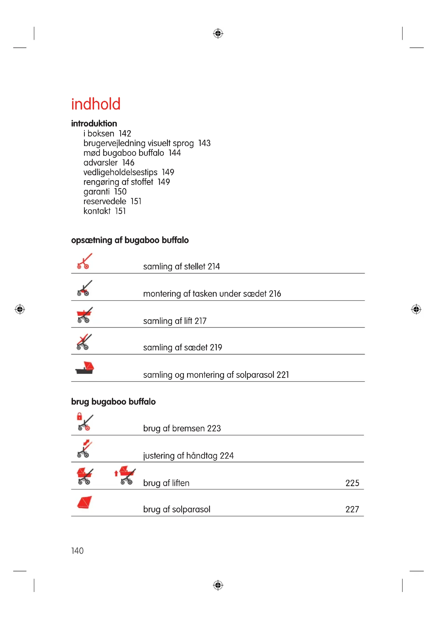 TRindhold introduktion i boksen 142 brugervejledning visuelt sprog 143 mød bugaboo buffalo 144 advarsler 146 vedligeholdelsestips 149 rengøring af stoffet 149 garanti 150 reservedele 151 kontakt 151 opsætning af bugaboo buffalo samling af stellet 214 montering af tasken under sædet 216 samling af lift 217 samling af sædet 219 samling og montering af solparasol 221 brug bugaboo buffalo brug af bremsen 223 justering af håndtag 224 brug af liften 225 brug af solparasol 227 140brug af sædet 228 brug af sele 231 brug af bærehåndtag 232 brug af en taske på håndtaget 233 et stykke foldning med liften vendt mod forældrene 234 et stykke foldning med sædet vendt mod forældrene 236 et stykke foldning med sædet vendt mod verden 238 foldning af et stykke 240 foldning af chassiset 241 foldning af liften 242 brug af håndledsstrop 244 låsning/oplåsning af svirvel hjulene på ujævnt terræn 245 brug af to hjuls position for sand eller sne 246 fjernelse af hjulene 248 brug af regn dækken 249