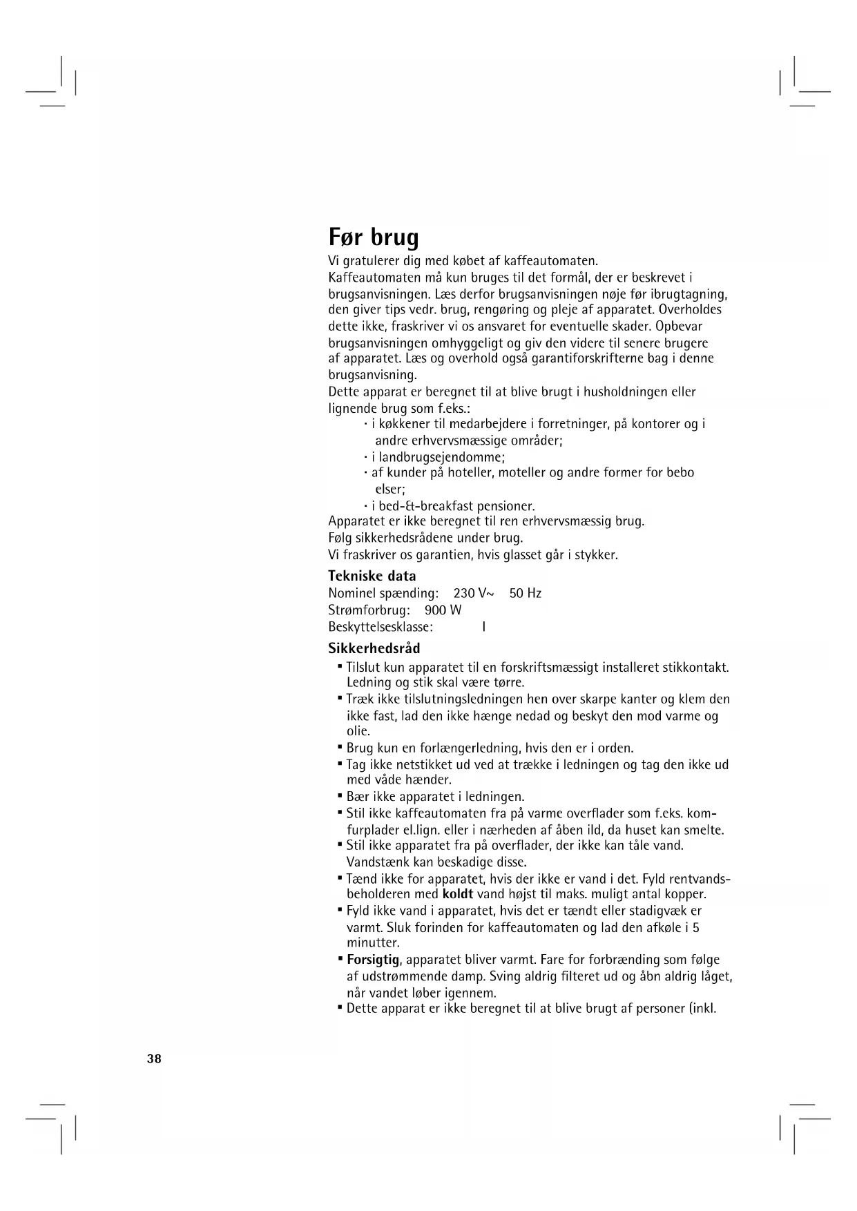 - Dyp ikke apparatet i vand.Vi fraskriver os ansvaret for evt. skader, der opstår, hvis apparatet bruges til formål, det ikke er beregnet til, hvis afkalkningshenvisningerne ikke overholdes eller hvis det betjenes eller repareres forkert. I sådanne tilfælde dækker garantien heller ikke.