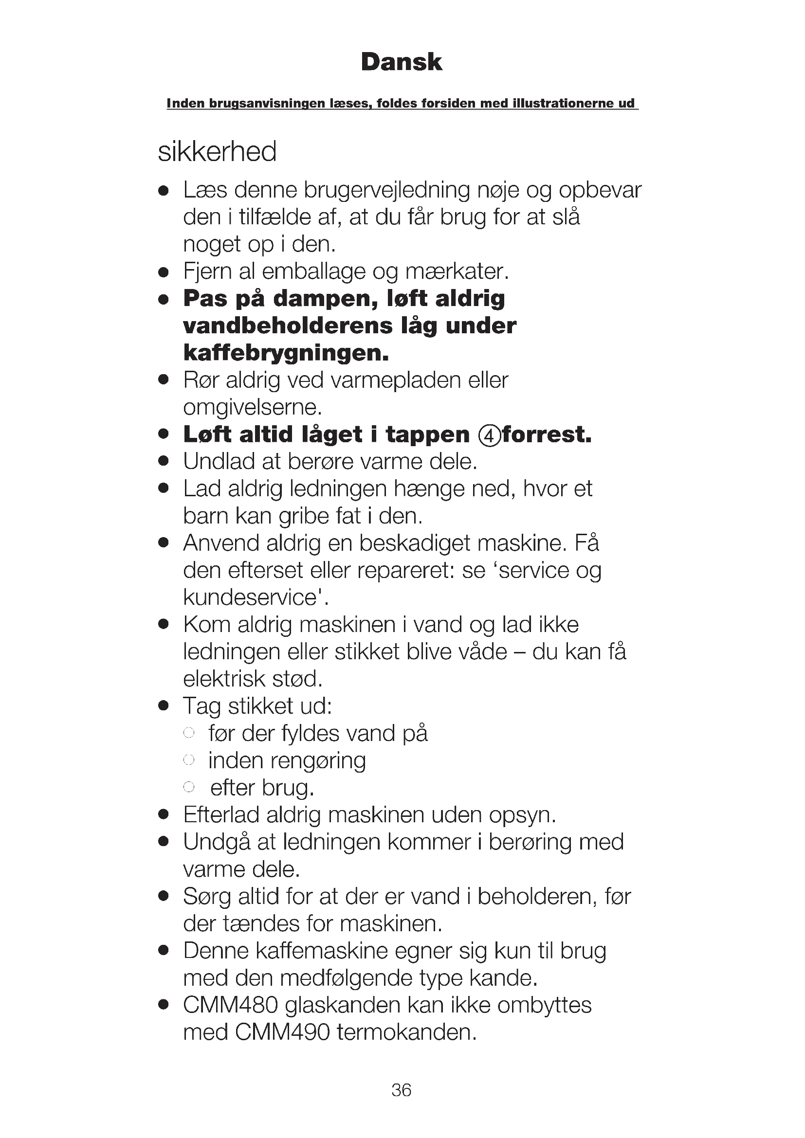 nden brugsanvisningen læses, foldes forsiden med illustrationerne ud sikkerhed