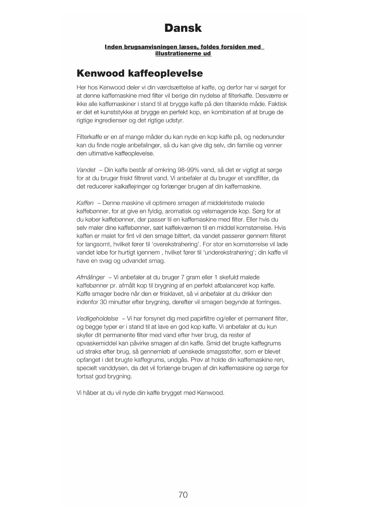kke alle kaffemaskiner i stand til at brygge kaffe på den tiltænkte måde. Faktisk er det et kunststykke at brygge en perfekt kop, en kombination af at bruge de rigtige ingredienser og det rigtige udstyr. Filterkaffe er en af mange måder du kan nyde en kop kaffe på, og nedenunder kan du finde nogle anbefalinger, så du kan give dig selv, din familie og venner den ultimative kaffeoplevelse. Vandet ~ Din kaffe består af omkring 98-99% vand, så det er vigtigt at sørge for at du bruger friskt filtreret vand. Vi anbefaler at du bruger et vandfilter, da det reducerer kalkaflejringer og forlænger brugen af din kaffemaskine. Kaffen ~ Denne maskine vil optimere smagen af middelristede malede kaffebønner, for at give en fyldig, aromatisk og velsmagende kop. Sørg for at du køber kaffebønner, der passer til en kaffemaskine med filter. Eller hvis du selv maler dine kaffebønner, sæt kaffekværnen til en middel kornstørrelse. Hvis kaffen er malet for fint vil den smage bittert, da vandet passerer gennem filteret for langsomt, hvilket fører til 'overekstrahering'. For stor en kornstørrelse vil lade vandet løbe for hurtigt igennem , hvilket fører til 'underekstrahering'; din kaffe vil have en svag og udvandet smag. Afmålinger ~ Vi anbefaler at du bruger 7 gram eller 1 skefuld malede kaffebønner pr. afmålt kop til brygning af en perfekt afbalanceret kop kaffe. Kaffe smager bedre når den er frisklavet, så vi anbefaler at du drikker den indenfor 30 minutter efter brygning, derefter vil smagen begynde at forringes. Vedligeholdelse ~ Vi har forsynet dig med papirfiltre og/eller et permanent filter, og begge typer er i stand til at lave en god kop kaffe. Vi anbefaler at du kun skyller dit permanente filter med vand efter hver brug, da rester af opvaskemiddel kan påvirke smagen af din kaffe. Smid det brugte kaffegrums ud straks efter brug, så gennemløb af uønskede smagsstoffer, som er blevet opfanget i det brugte kaffegrums, undgås. Prøv at holde din kaffemaskine ren, specielt vanddysen, da det vil forlænge brugen af din kaffemaskine og sørge for fortsat god brygning. Vi håber at du vil nyde din kaffe brygget med Kenwood. Dansk