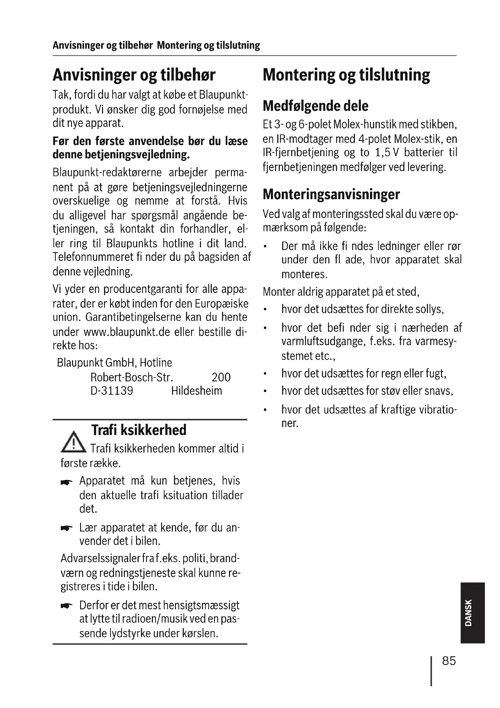 Blaupunkt-redaktørne arbejder permanent på at gore betjeningsvejledningerne overskuelige og nemme at forsta. Hvis du alligevel har sporgsmål angående betjeningen, sä kontakt din forhandler, el-ler ring til Blaupunkts hotline i dit land. Telefonummeret fi nder du på bagsiden af donne vejledning.