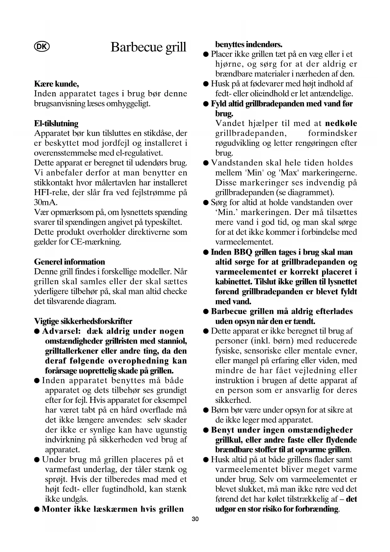 Nel caso dei modelli con il recipiente del grill in alluminio, è facile che il recipiente con il passar del tempo, perda il suo colore originale. E’ un fenomeno perfettamente normale e non compromette l’uso in tutta sicurezza del barbecue grill. Come riporre il barbecue grill Dopo averlo pulito, riponete il barbecue grill in un locale al chiuso e non umido. Smaltimento Non smaltite apparecchi vecchi o difettosi gettandoli tra i normali rifiuti domestici, ma solo tramite i punti di raccolta pubblici. Dichiarazione di garanzia La garanzia sui nostri prodotti ha validità di 2 anni dalla data di vendita (certificata da scontrino fiscale) e comprende gli eventuali difetti del materiale o di particolari di costruzione. I danni derivanti da un uso improprio, rotture da caduta o similari non vengono riconosciuti. La presente garanzia non pregiudica i vostri diritti legali, né i diritti acquisiti in quanto consumatore e riconosciuti dalla legislazione nazionale vigente che disciplina l'acquisto di beni. La garanzia decade nel momento in cui gli apparecchi vengono aperti o manomessi da Centri non da noi autorizzati. 29Kære kunde, Inden apparatet tages i brug bør denne brugsanvisning læses omhyggeligt. El-tilslutning Apparatet bør kun tilsluttes en stikdåse, der er beskyttet mod jordfejl og installeret i overensstemmelse med el-regulativet. Dette apparat er beregnet til udendørs brug. Vi anbefaler derfor at man benytter en stikkontakt hvor målertavlen har installeret HFI-relæ, der slår fra ved fejlstrømme på 30mA. Vær opmærksom på, om lysnettets spænding svarer til spændingen angivet på typeskiltet. Dette produkt overholder direktiverne som gælder for CE-mærkning. Generel information Denne grill findes i forskellige modeller. Når grillen skal samles eller der skal sættes yderligere tilbehør på, skal man altid checke det tilsvarende diagram. Vigtige sikkerhedsforskrifter ● Advarsel: dæk aldrig under nogen omstændigheder grillristen med stanniol, grilltallerkener eller andre ting, da den deraf følgende overophedning kan forårsage uoprettelig skade på grillen. ● Inden apparatet benyttes må både apparatet og dets tilbehør ses grundigt efter for fejl. Hvis apparatet for eksempel har været tabt på en hård overflade må det ikke længere anvendes: selv skader der ikke er synlige kan have ugunstig indvirkning på sikkerheden ved brug af apparatet. ● Under brug må grillen placeres på et varmefast underlag, der tåler stænk og sprøjt. Hvis der tilberedes mad med et højt fedt- eller fugtindhold, kan stænk ikke undgås. ● Monter ikke læskærmen hvis grillen benyttes indendørs. ● Placer ikke grillen tæt på en væg eller i et hjørne, og sørg for at der aldrig er brændbare materialer i nærheden af den. ● Husk på at fødevarer med højt indhold af fedt- eller olieindhold er let antændelige. ● Fyld altid grillbradepanden med vand før brug. Vandet hjælper til med at nedkøle grillbradepanden, formindsker røgudvikling og letter rengøringen efter brug. ● Vandstanden skal hele tiden holdes mellem 'Min' og 'Max' markeringerne. Disse markeringer ses indvendig på grillbradepanden (se diagrammet). ● Sørg for altid at holde vandstanden over ‘Min.’ markeringen. Der må tilsættes mere vand i god tid, og man skal sørge for at det ikke kommer i forbindelse med varmeelementet. ● Inden BBQ grillen tages i brug skal man altid sørge for at grillbradepanden og varmeelementet er korrekt placeret i kabinettet. Tilslut ikke grillen til lysnettet førend grillbradepanden er blevet fyldt med vand. ● Barbecue grillen må aldrig efterlades uden opsyn når den er tændt. ● Dette apparat er ikke beregnet til brug af personer (inkl. børn) med reducerede fysiske, sensoriske eller mentale evner, eller mangel på erfaring eller viden, med mindre de har fået vejledning eller instruktion i brugen af dette apparat af en person som er ansvarlig for deres sikkerhed. ● Børn bør være under opsyn for at sikre at de ikke leger med apparatet. ● Benyt under ingen omstændigheder grillkul, eller andre faste eller flydende brændbare stoffer til at opvarme grillen. ● Husk altid på at både grillens flader samt varmeelementet bliver meget varme under brug. Selv om varmeelementet er blevet slukket, må man ikke røre ved det førend det har kølet tilstrækkelig af – det udgør en stor risiko for forbrænding.