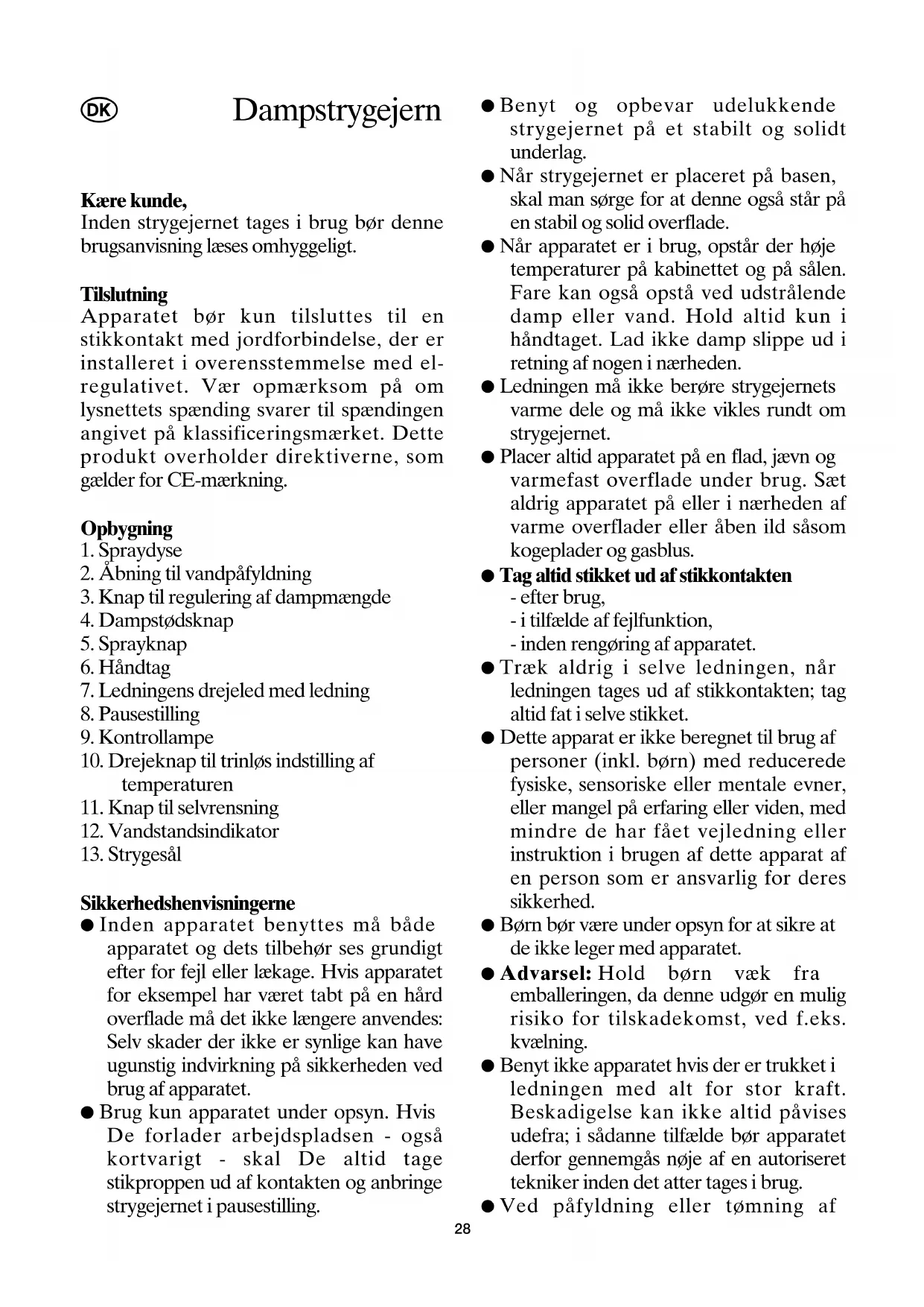 Sikkerhedshenvisningerne ● Inden apparatet benyttes må både apparatet og dets tilbehør ses grundigt efter for fejl eller lækage. Hvis apparatet for eksempel har været tabt på en hård overflade må det ikke længere anvendes: Selv skader der ikke er synlige kan have ugunstig indvirkning på sikkerheden ved brug af apparatet. ● Brug kun apparatet under opsyn. Hvis De forlader arbejdspladsen - også kortvarigt - skal De altid tage stikproppen ud af kontakten og anbringe strygejernet i pausestilling. ● Benyt og opbevar udelukkende strygejernet på et stabilt og solidt underlag. ● Når strygejernet er placeret på basen, skal man sørge for at denne også står på en stabil og solid overflade. ● Når apparatet er i brug, opstår der høje temperaturer på kabinettet og på sålen. Fare kan også opstå ved udstrålende damp eller vand. Hold altid kun i håndtaget. Lad ikke damp slippe ud i retning af nogen i nærheden. ● Ledningen må ikke berøre strygejernets varme dele og må ikke vikles rundt om strygejernet. ● Placer altid apparatet på en flad, jævn og varmefast overflade under brug. Sæt aldrig apparatet på eller i nærheden af varme overflader eller åben ild såsom kogeplader og gasblus. ● Tag altid stikket ud af stikkontakten - efter brug, - i tilfælde af fejlfunktion, - inden rengøring af apparatet. ● Træk aldrig i selve ledningen, når ledningen tages ud af stikkontakten; tag altid fat i selve stikket. ● Dette apparat er ikke beregnet til brug af personer (inkl. børn) med reducerede fysiske, sensoriske eller mentale evner, eller mangel på erfaring eller viden, med mindre de har fået vejledning eller instruktion i brugen af dette apparat af en person som er ansvarlig for deres sikkerhed. ● Børn bør være under opsyn for at sikre at de ikke leger med apparatet. ● Advarsel: Hold børn væk fra emballeringen, da denne udgør en mulig risiko for tilskadekomst, ved f.eks. kvælning. ● Benyt ikke apparatet hvis der er trukket i ledningen med alt for stor kraft. Beskadigelse kan ikke altid påvises udefra; i sådanne tilfælde bør apparatet derfor gennemgås nøje af en autoriseret tekniker inden det atter tages i brug. ● Ved påfyldning eller tømning af