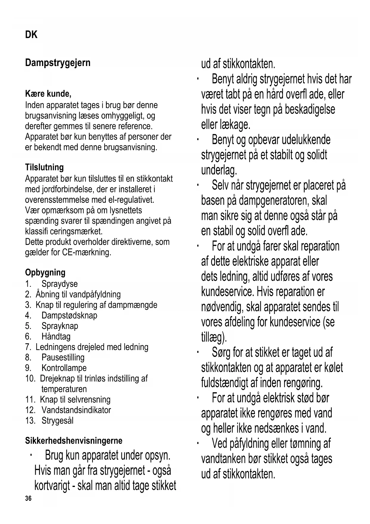 Sikkerhedshenvisningerne ∙ Brug kun apparatet under opsyn. Hvis man går fra strygejernet - også kortvarigt - skal man altid tage stikket ud af stikkontakten. ∙ Benyt aldrig strygejernet hvis det har været tabt på en hård overfl ade, eller hvis det viser tegn på beskadigelse eller lækage. ∙ Benyt og opbevar udelukkende strygejernet på et stabilt og solidt underlag. ∙ Selv når strygejernet er placeret på basen på dampgeneratoren, skal man sikre sig at denne også står på en stabil og solid overfl ade. ∙ For at undgå farer skal reparation af dette elektriske apparat eller dets ledning, altid udføres af vores kundeservice. Hvis reparation er nødvendig, skal apparatet sendes til vores afdeling for kundeservice (se tillæg). ∙ Sørg for at stikket er taget ud af stikkontakten og at apparatet er kølet fuldstændigt af inden rengøring. ∙ For at undgå elektrisk stød bør apparatet ikke rengøres med vand og heller ikke nedsænkes i vand. ∙ Ved påfyldning eller tømning af vandtanken bør stikket også tages ud af stikkontakten. DK37 ∙ Dette apparat kan benyttes af børn (som er mindst 8 år) og af personer med reducerede fysiske, sensoriske eller mentale evner, eller mangel på erfaring eller viden, såfremt de har fået vejledning og instruktion i brugen af dette apparat og fuldt ud forstår alle farer og forholdsregler vedrørende sikkerheden som brug af apparatet medfører. ∙ Børn må aldrig få lov til at lege med apparatet. ∙ Børn må aldrig få lov til at udføre rengørings- eller vedligeholdelsesarbejde på dette apparat, medmindre de er under opsyn og mindst 8 år gamle. ∙ Når apparatet er tændt eller stadig køler af efter brug, må strygejernet og dets ledning altid holdes væk fra børn som er yngre en 8 år. ∙ Advarsel: Hold børn væk fra emballeringen, da denne udgør en mulig risiko for tilskadekomst, ved f.eks. kvælning. ∙ Benyt ikke apparatet hvis der er trukket i ledningen med alt for stor kraft. Beskadigelse kan ikke altid påvises udefra; i sådanne tilfælde bør apparatet derfor gennemgås nøje af en autoriseret tekniker inden det atter tages i brug. ∙ Når strygejernet er tændt, kommer både kabinettet og strygesålen op på meget høje temperaturer. Fare kan også opstå ved udstrålende damp eller vand. Lad aldrig damp slippe ud i retning af nogen i nærheden. Hold altid kun i håndtaget. ∙ Strygejernet bør udelukkende placeres på varmefaste overfl ader, aldrig nær ved varme fl ader (f.eks. varmeplader) eller i nærheden af åben ild. ∙ Ledningen må ikke berøre strygejernets varme dele og må ikke vikles rundt om strygejernet. ∙ Tag altid stikket ud af stikkontakten - efter brug, - i tilfælde af fejlfunktion, - inden rengøring af apparatet. ∙ Træk aldrig i selve ledningen, når ledningen tages ud af stikkontakten; tag altid fat i selve stikket. ∙ Vi påtager os intet ansvar for skader, der skyldes misbrug eller manglende overholdelse af denne brugsanvisning. ∙ Dette apparat er beregnet til privat brug eller i tilsvarende omgivelser, såsom - kontorer eller andre mindre virksomheder, - landbrugsvirksomheder, - af kunder på hoteller, moteller m.m. og tilsvarende foretagender, - B&B pensionater. Kalkfi lter Et særligt fi lter i dampgeneratorens vandbeholder blødgør vandet og mindsker kalkdannelse på strygesålen. Vandpåfyldning Fyld vandbeholderen inden dampfunktionen eller spraydysen tages i brug. Tag stikproppen ud af kontakten.38 ∙ Strygejernet er modstandsdygtigt overfor kalk i vand til en hårdhedsgrad på ca. 15dH. Vi anbefaler, at De anvender afkalket vand. Hvis De ikke kender vandets hårdhedsgrad i Deres område, bedes De venligst forespørge på det lokale vandværk. ∙ For at undgå at der drypper vand ud af strygesålen, skal man sørge for at knappen til regulering af dampmængden først er slået fra. Den bør først åbnes når temperaturen er oppe på det niveau som kræves til dampstrygning (som anvist på drejeknappen for temperaturkontrol). ∙ Åben vandbeholderens låg. ∙ Fyld den tomme vandbeholder ved at bruge det medfølgende målebæger. Vær opmærksom på kun at fylde i til markeringslinjen “Max”. ∙ Luk vandbeholderens låg. Drypstop Hvis strygesålens temperatur ikke er høj nok til at producere damp, bliver vandtilførslen automatisk afbrudt for at forhindre dryp Generelle henvisninger Undersøg først, om der er en strygeanvisning i den ting, som De skal stryge. ∙ Strygesymbolerne har følgende betydning:
