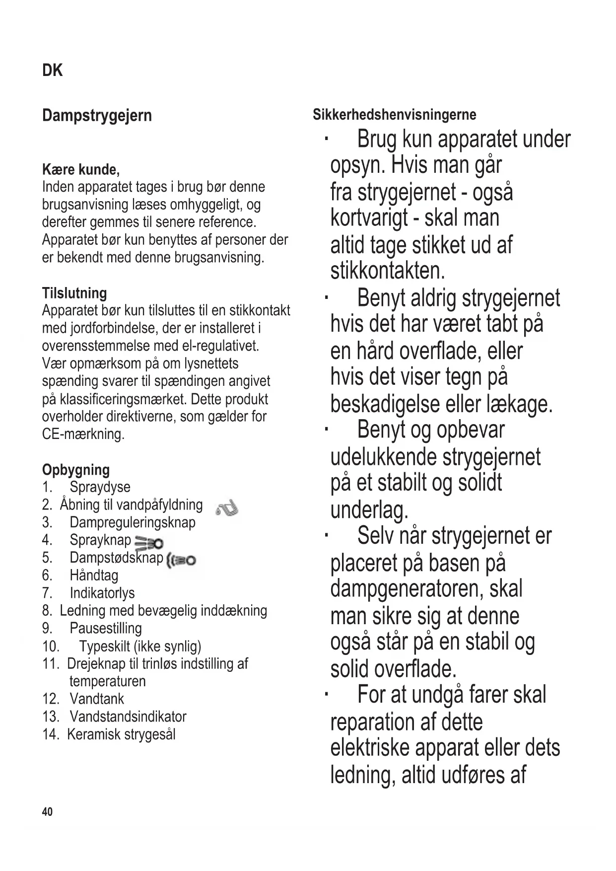 ∙ Hvis vasketøjet tørres i tørretumbler, bør tørretumblerens temperatur indstilles på “strygetørt”. Hvis tøjet er for tørt, kan det ikke stryges glat uden problemer. Før brug Rengør strygejernet som beskrevet i afsnittet om “Rengøring og vedligehold - Selvrensningssystemet”. Evt. støv på strygesålen vil forsvinde ligesom strygejernets egenlugt. Advarsel: Sørg for god udluftning. Strygning ∙ Dampstrygning er kun mulig i højeste temperaturindstilling. Temperaturindstillingenndespå drejeknappen på strygejernet. ∙ Anbring strygejernet i pausestilling og sæt stikket i stikkontakten. ∙ Lige så snart dampstrygejernet er tilsluttet strømforsyningen, vil indikatorlyset tændes. ∙ Indstil den ønskede temperatur på drejeknappen som anvist af strygesymbolerne. ∙ Indikatorlyset vil slukke så snart den indstillede strygetemperatur er nået. ∙ Inden strygningen påbegyndes bør strygesålen rengøres ved at stryge hen over en forvasket, ren bomuldsklud inden der stryges noget andet. Brug af dampfunktionen kan også være med til atrensestøvpartiklerellerresterafbre ud af åbningerne i strygesålen. ∙ På dampreguleringsknappen kan man indstille den ønskede dampmængde, eller den kan frakobles helt ved tørstrygning. ∙ Ved tørstrygning kan vandbeholderen være tom. Hvis der skulle være vand tilbage i vandtanken, kan dampskud dog også benyttes når der tørstryges ved høje temperaturer. ∙ Efter brug anbringes strygejernet i pausestilling for afkøling, og stikket tages ud af kontakten. Dampstød ∙ Når man trykker på dampstødsknappen , trykkes der ekstra damp ud gennem strygejernets sål. Denne funktion er meget nyttig, når den mængde damp der almindeligvis slippes ud ikke er nok til at fjerne skarpe folder eller ved strygning af svære eller kraftige stoffer. ∙ Denne funktion kan også anvendes, mens strygejernet holdes lodret til at fjerne folder eller rynker fra stof. Spraydysen Ved tryk på sprayknappen tilføres vand. Denne knap bruges, hvis det man stryger er for tørt. Spraydysen kan benyttes ved alle temperaturindstillinger og både ved tør- og dampstrygning. Rengøring og vedligehold ∙ Sørg for at stikket er taget ud af stikkontakten og at apparatet er kølet fuldstændigt af inden rengøring. ∙ For at undgå elektrisk stød bør apparatet ikke rengøres med vand og heller ikke nedsænkes i vand. ∙ Aftør om nødvendigt strygejernet med en ren, tør klud. ∙ Strygesålen rengøres for evt. fedt og44 104 x 142 mm lign. med en uld- eller stofklud, der er dyppet i en blanding af eddike og vand. ∙ Brug aldrig skarpe genstande eller skurende rengøringsmidler. ∙ Fyld aldrig eddike eller andre afkalkningsmidler i vandbeholderen. Selvrensningssystemet Selvrensningssystemet skyller løse mineralaejringerudogholderapparatetfri for kalk- og støvpartikler. Selvrensningen bør udføres hvis apparatet ikke har været i brug i længere tid, og ellers hver 10. – 15. dag. Gør således: ∙ Fyld vandbeholderen halvt med vand. ∙ Placer strygejernet i pausestilling og sæt stikket i stikkontakten. ∙ Sæt temperaturknappen på den højeste indstilling. ∙ Drej dampreguleringsknappen til ‘tør strygning’ positionen. ∙ Vent indtil indikatorlyset slukker. ∙ Tag stikket ud af stikkontakten. ∙ Hold strygejernet vandret hen over en vask. ∙ Drej dampreguleringsknappen til CLEAN positionen og tryk ned. ∙ Med dampreguleringsknappen nedtrykket, svinges strygejernet blidt frem og tilbage indtil der ikke længere kommer damp eller vand ud. ∙ Hæld overskydende vand ud af vandbeholderen. ∙ Lad strygesålen køle af inden den rengøres med en letfugtig, fnugfri klud. Opbevaring ∙ Tag stikket ud af stikkontakten og lad strygejernet køle af. ∙ Overskydende vand i vandbeholderen hældes ud gennem påfyldningsåbningen. ∙ Anbring altid strygejernet lodret - i pausestilling - så sålen ikke beskadiges. Bortskaffelse Apparater mærket med dette symbol må ikke smides ud sammen med husholdningsaffaldet, da de indeholder værdifulde materialer som kan genbruges. Korrekt bortskaffelse beskytter både miljøet og menneskers helbred. Din kommune eller forhandleren kan give dig yderligere information om dette. Garantierklæring På dette husholdningsprodukt overtager vi garantien i to år fra salgsdatoen. Garantien gælder for materiale- og fabrikationsfejl. Skader, der er opstået som følge af forkert behandling, normalt slid samt på skrøbelige dele som f.eks. glas, dækkes ikke af garantien. Denne garanti har ingen indvirkning på dine lovmæssige rettigheder, heller ikke de nationale forbrugerrettigheder om anskaffelse af varer. Hvis produktet ikke fungerer og må returneres, skal det pakkes forsvarligt ind, og navn, adresse samt årsagen til returneringen skal vedlægges. Hvis dette sker mens garantien stadig dækker, må garantibeviset og kvitteringen også lægges ved. Garantien bortfalder ligeledes ved indgreb på produktet af folk, der ikke er autoriseret af os.104 x 142 mm