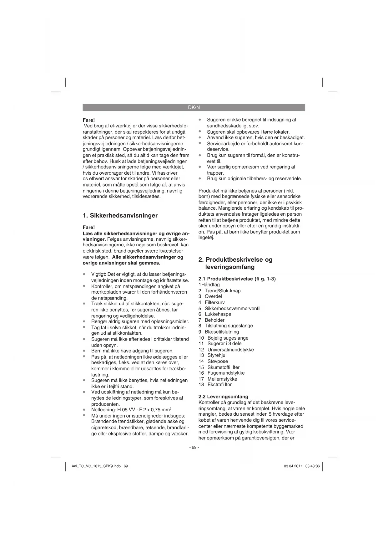 Kontroller på grundlag af det beskrevne leve- ringsomfang, at varen er komplet. Hvis nogle dele mangler, bedes du senest inden 5 hverdage efter købet af varen henvende dig til vores service- center eller nærmeste kompetente byggemarked med forevisning af gyldig købskvittering. Vær her opmærksom på garantioversigten, der er Anl_TC_VC_1815_SPK9.indb 69Anl_TC_VC_1815_SPK9.indb 69 03.04.2017 08:48:0603.04.2017 08:48:06DK/N