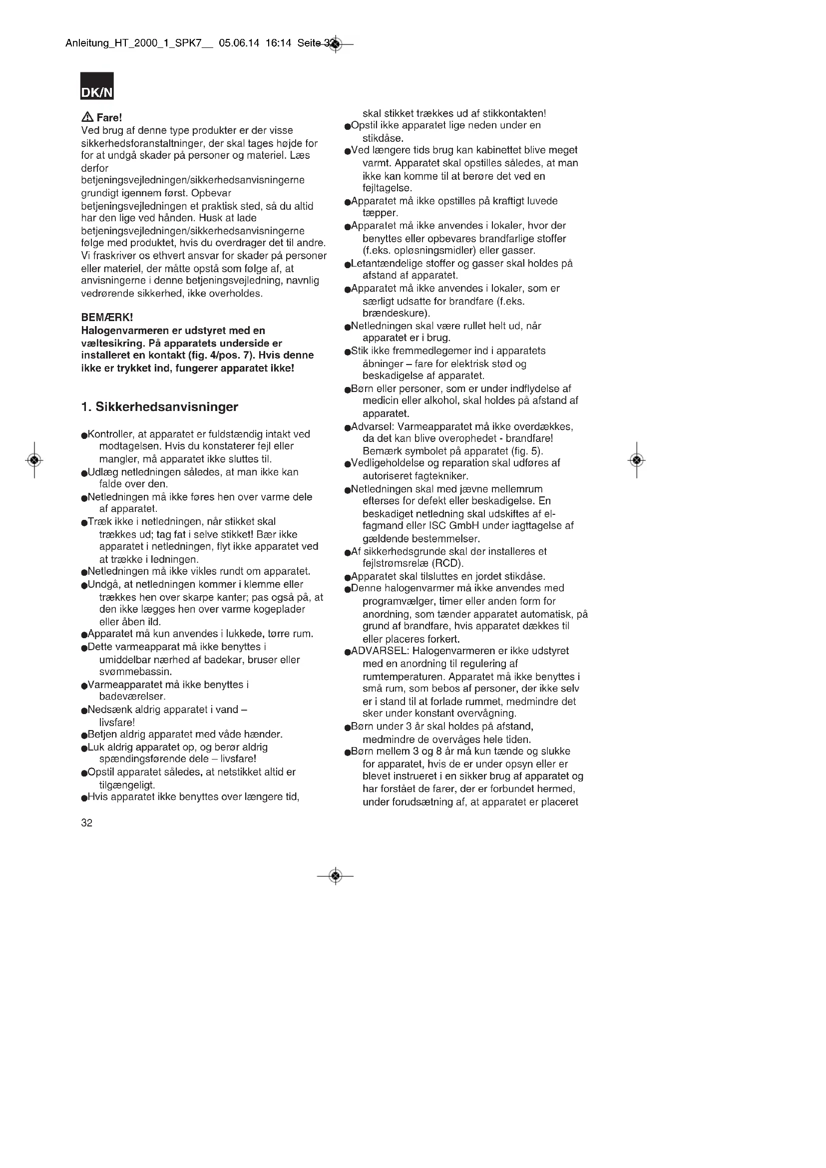 Anleitung_HT_2000_1_SPK7__ 05.06.14 16:14 Seite 31 Fare! Ved brug af denne type produkter er der visse sikkerhedsforanstaltninger, der skal tages højde for for at undgå skader på personer og materiel. Læs derfor betjeningsvejledningen/sikkerhedsanvisningerne grundigt igennem først. Opbevar betjeningsvejledningen et praktisk sted, så du altid har den lige ved hånden. Husk at lade betjeningsvejledningen/sikkerhedsanvisningerne følge med produktet, hvis du overdrager det til andre. Vi fraskriver os ethvert ansvar for skader på personer eller materiel, der måtte opstå som følge af, at anvisningerne i denne betjeningsvejledning, navnlig vedrørende sikkerhed, ikke overholdes. BEMÆRK! Halogenvarmeren er udstyret med en væltesikring. På apparatets underside er installeret en kontakt (fig. 4/pos. 7). Hvis denne ikke er trykket ind, fungerer apparatet ikke!