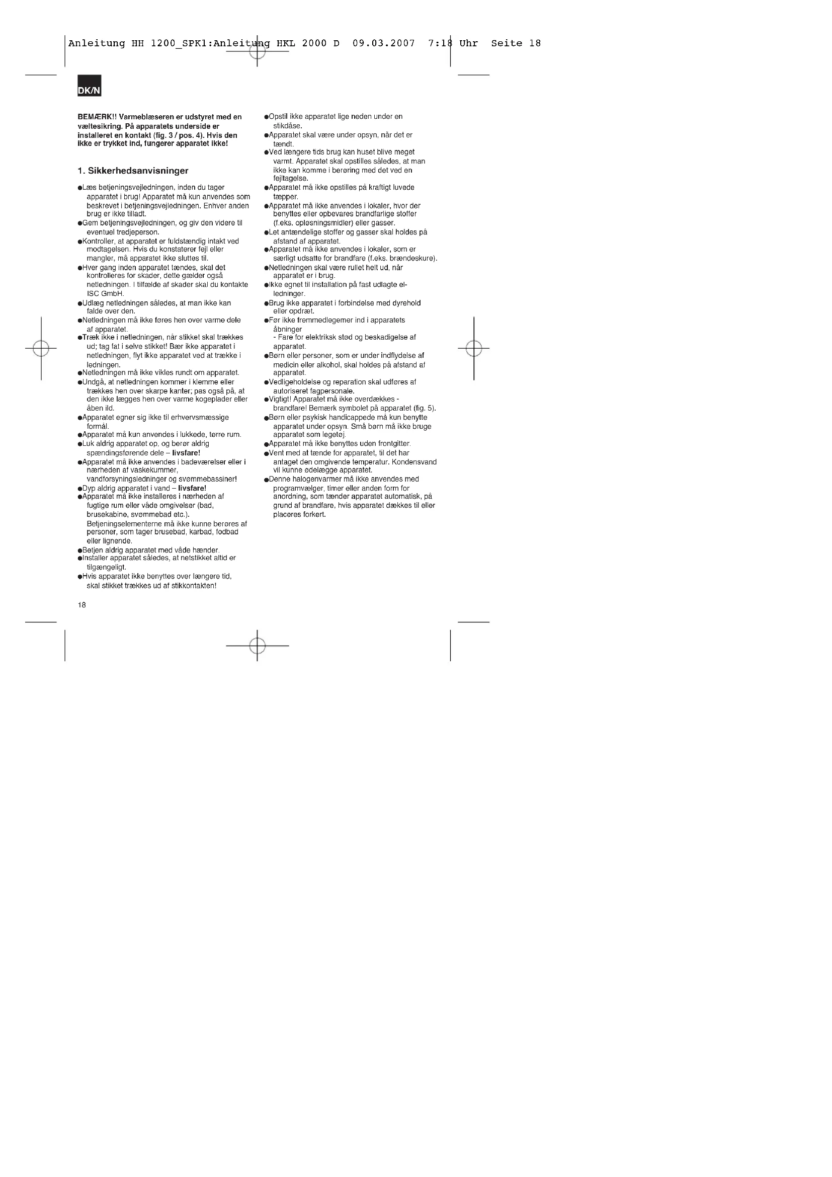 앬 Læs betjeningsvejledningen, inden du tager apparatet i brug! Apparatet må kun anvendes som beskrevet i betjeningsvejledningen. Enhver anden brug er ikke tilladt. 앬 Gem betjeningsvejledningen, og giv den videre til eventuel tredjeperson. 앬 Kontroller, at apparatet er fuldstændig intakt ved modtagelsen. Hvis du konstaterer fejl eller mangler, må apparatet ikke sluttes til. 앬 Hver gang inden apparatet tændes, skal det kontrolleres for skader, dette gælder også netledningen. I tilfælde af skader skal du kontakte ISC GmbH. 앬 Udlæg netledningen således, at man ikke kan falde over den. 앬 Netledningen må ikke føres hen over varme dele af apparatet. 앬 Træk ikke i netledningen, når stikket skal trækkes ud; tag fat i selve stikket! Bær ikke apparatet i netledningen, flyt ikke apparatet ved at trække i ledningen. 앬 Netledningen må ikke vikles rundt om apparatet. 앬 Undgå, at netledningen kommer i klemme eller trækkes hen over skarpe kanter; pas også på, at den ikke lægges hen over varme kogeplader eller åben ild. 앬 Apparatet egner sig ikke til erhvervsmæssige formål. 앬 Apparatet må kun anvendes i lukkede, tørre rum. 앬 Luk aldrig apparatet op, og berør aldrig spændingsførende dele – livsfare! 앬 Apparatet må ikke anvendes i badeværelser eller i nærheden af vaskekummer, vandforsyningsledninger og svømmebassiner! 앬 Dyp aldrig apparatet i vand – livsfare! 앬 Apparatet må ikke installeres i nærheden af fugtige rum eller våde omgivelser (bad, brusekabine, svømmebad etc.). Betjeningselementerne må ikke kunne berøres af personer, som tager brusebad, karbad, fodbad eller lignende. 앬 Betjen aldrig apparatet med våde hænder. 앬 Installer apparatet således, at netstikket altid er tilgængeligt. 앬 Hvis apparatet ikke benyttes over længere tid, skal stikket trækkes ud af stikkontakten! 앬 Opstil ikke apparatet lige neden under en stikdåse. 앬 Apparatet skal være under opsyn, når det er tændt. 앬 Ved længere tids brug kan huset blive meget varmt. Apparatet skal opstilles således, at man ikke kan komme i berøring med det ved en fejltagelse. 앬 Apparatet må ikke opstilles på kraftigt luvede tæpper. 앬 Apparatet må ikke anvendes i lokaler, hvor der benyttes eller opbevares brandfarlige stoffer (f.eks. opløsningsmidler) eller gasser. 앬 Let antændelige stoffer og gasser skal holdes på afstand af apparatet. 앬 Apparatet må ikke anvendes i lokaler, som er særligt udsatte for brandfare (f.eks. brændeskure). 앬 Netledningen skal være rullet helt ud, når apparatet er i brug. 앬 Ikke egnet til installation på fast udlagte el- ledninger. 앬 Brug ikke apparatet i forbindelse med dyrehold eller opdræt. 앬 Før ikke fremmedlegemer ind i apparatets åbninger - Fare for elektriksk stød og beskadigelse af apparatet. 앬 Børn eller personer, som er under indflydelse af medicin eller alkohol, skal holdes på afstand af apparatet. 앬 Vedligeholdelse og reparation skal udføres af autoriseret fagpersonale. 앬 Vigtigt! Apparatet må ikke overdækkes - brandfare! Bemærk symbolet på apparatet (fig. 5). Børn eller psykisk handicappede må kun benytte apparatet under opsyn. Små børn må ikke bruge apparatet som legetøj. Apparatet må ikke benyttes uden frontgitter. Vent med at tænde for apparatet, til det har antaget den omgivende temperatur. Kondensvand vil kunne ødelægge apparatet. Denne halogenvarmer må ikke anvendes med programvælger, timer eller anden form for anordning, som tænder apparatet automatisk, på grund af brandfare, hvis apparatet dækkes til eller placeres forkert. DK/N Anleitung HH 1200_SPK1:Anleitung HKL 2000 D 09.03.2007 7:18 Uhr Seite 1819