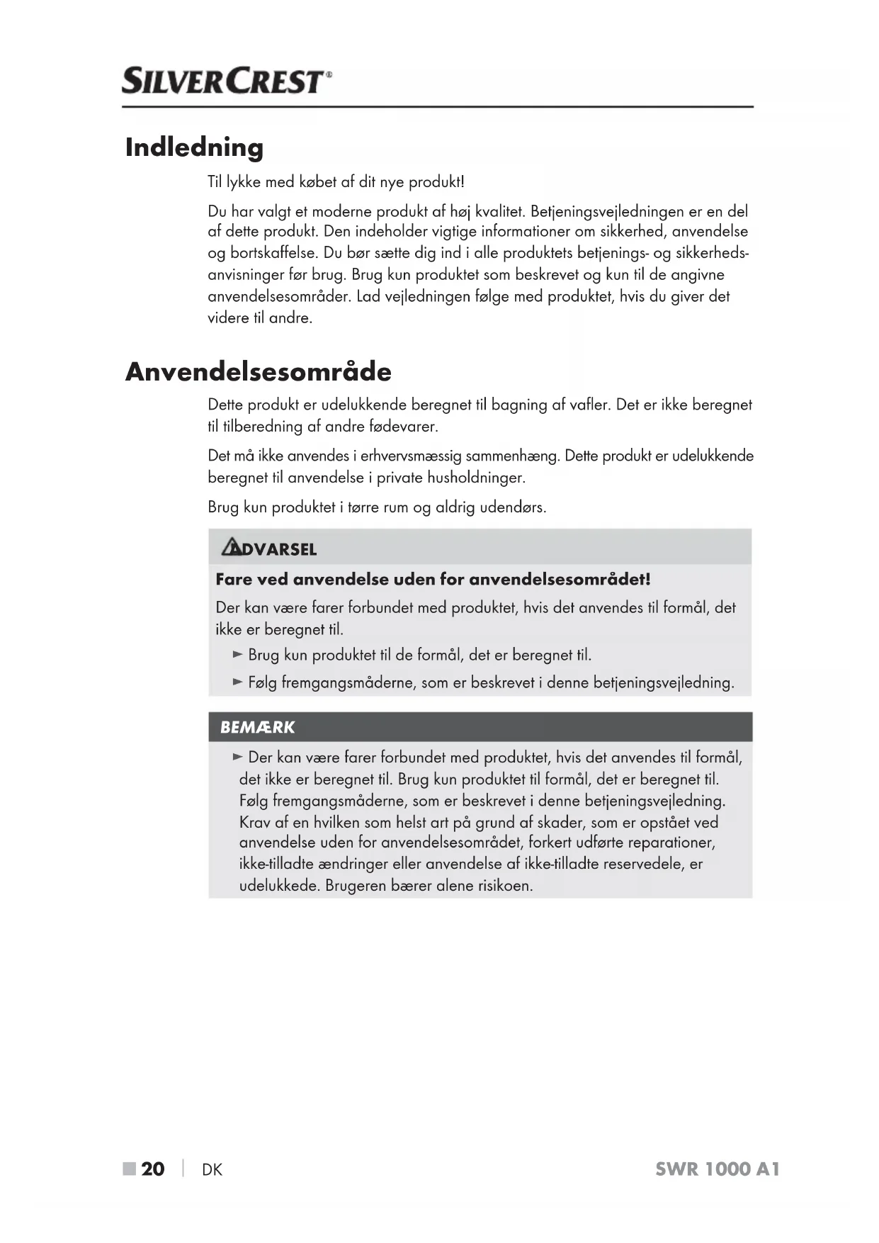 DK SWR 1000 A1 Indledning Til lykke med købet af dit nye produkt! Du har valgt et moderne produkt af høj kvalitet. Betjeningsvejledningen er en del af dette produkt. Den indeholder vigtige informationer om sikkerhed, anvendelse og bortskaffelse. Du bør sætte dig ind i alle produktets betjenings- og sikkerheds- anvisninger før brug. Brug kun produktet som beskrevet og kun til de angivne anvendelsesområder. Lad vejledningen følge med produktet, hvis du giver det videre til andre. Anvendelsesområde Dette produkt er udelukkende beregnet til bagning af vafler. Det er ikke beregnet til tilberedning af andre fødevarer. Det må ikke anvendes i erhvervsmæssig sammenhæng. Dette produkt er udelukkende beregnet til anvendelse i private husholdninger. Brug kun produktet i tørre rum og aldrig udendørs. ADVARSEL Fare ved anvendelse uden for anvendelsesområdet! Der kan være farer forbundet med produktet, hvis det anvendes til formål, det ikke er beregnet til. ► Brug kun produktet til de formål, det er beregnet til. ► Følg fremgangsmåderne, som er beskrevet i denne betjeningsvejledning. BEMÆRK ► Der kan være farer forbundet med produktet, hvis det anvendes til formål, det ikke er beregnet til. Brug kun produktet til formål, det er beregnet til. Følg fremgangsmåderne, som er beskrevet i denne betjeningsvejledning. Krav af en hvilken som helst art på grund af skader, som er opstået ved anvendelse uden for anvendelsesområdet, forkert udførte reparationer, ikke-tilladte ændringer eller anvendelse af ikke-tilladte reservedele, er udelukkede. Brugeren bærer alene risikoen.DK