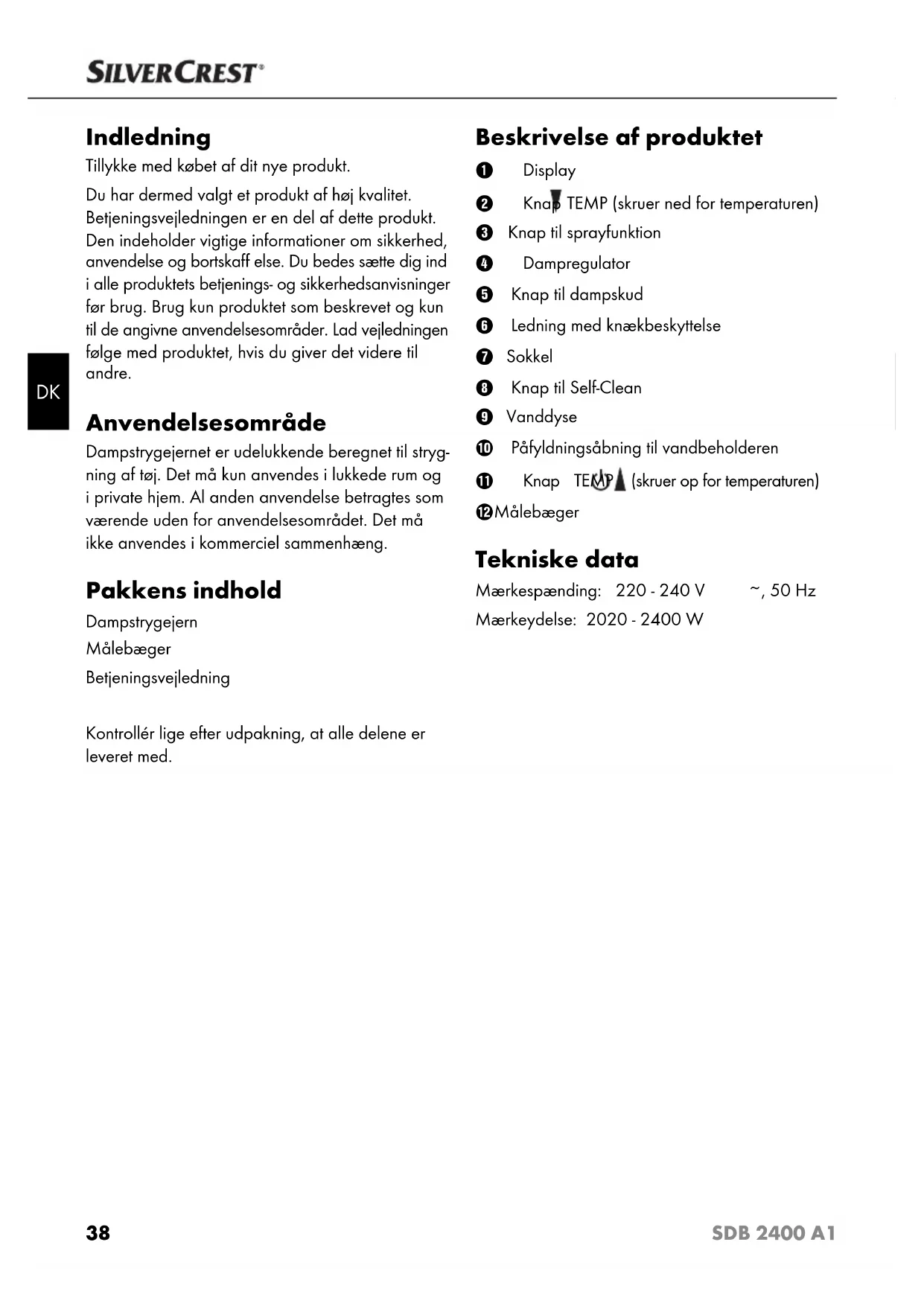 Indledning Tillykke med købet af dit nye produkt. Du har dermed valgt et produkt af høj kvalitet. Betjeningsvejledningen er en del af dette produkt. Den indeholder vigtige informationer om sikkerhed, anvendelse og bortskaff else. Du bedes sætte dig ind i alle produktets betjenings- og sikkerhedsanvisninger før brug. Brug kun produktet som beskrevet og kun til de angivne anvendelsesområder. Lad vejledningen følge med produktet, hvis du giver det videre til andre. Anvendelsesområde Dampstrygejernet er udelukkende beregnet til stryg- ning af tøj. Det må kun anvendes i lukkede rum og i private hjem. Al anden anvendelse betragtes som værende uden for anvendelsesområdet. Det må ikke anvendes i kommerciel sammenhæng. Pakkens indhold Dampstrygejern Målebæger Betjeningsvejledning Kontrollér lige efter udpakning, at alle delene er leveret med. Beskrivelse af produktet 1 Display 2 Knap TEMP (skruer ned for temperaturen) 3 Knap til sprayfunktion 4 Dampregulator 5 Knap til dampskud 6 Ledning med knækbeskyttelse 7 Sokkel 8 Knap til Self-Clean 9 Vanddyse 0 Påfyldningsåbning til vandbeholderen q Knap TEMP (skruer op for temperaturen) w Målebæger Tekniske data Mærkespænding: 220 - 240 V