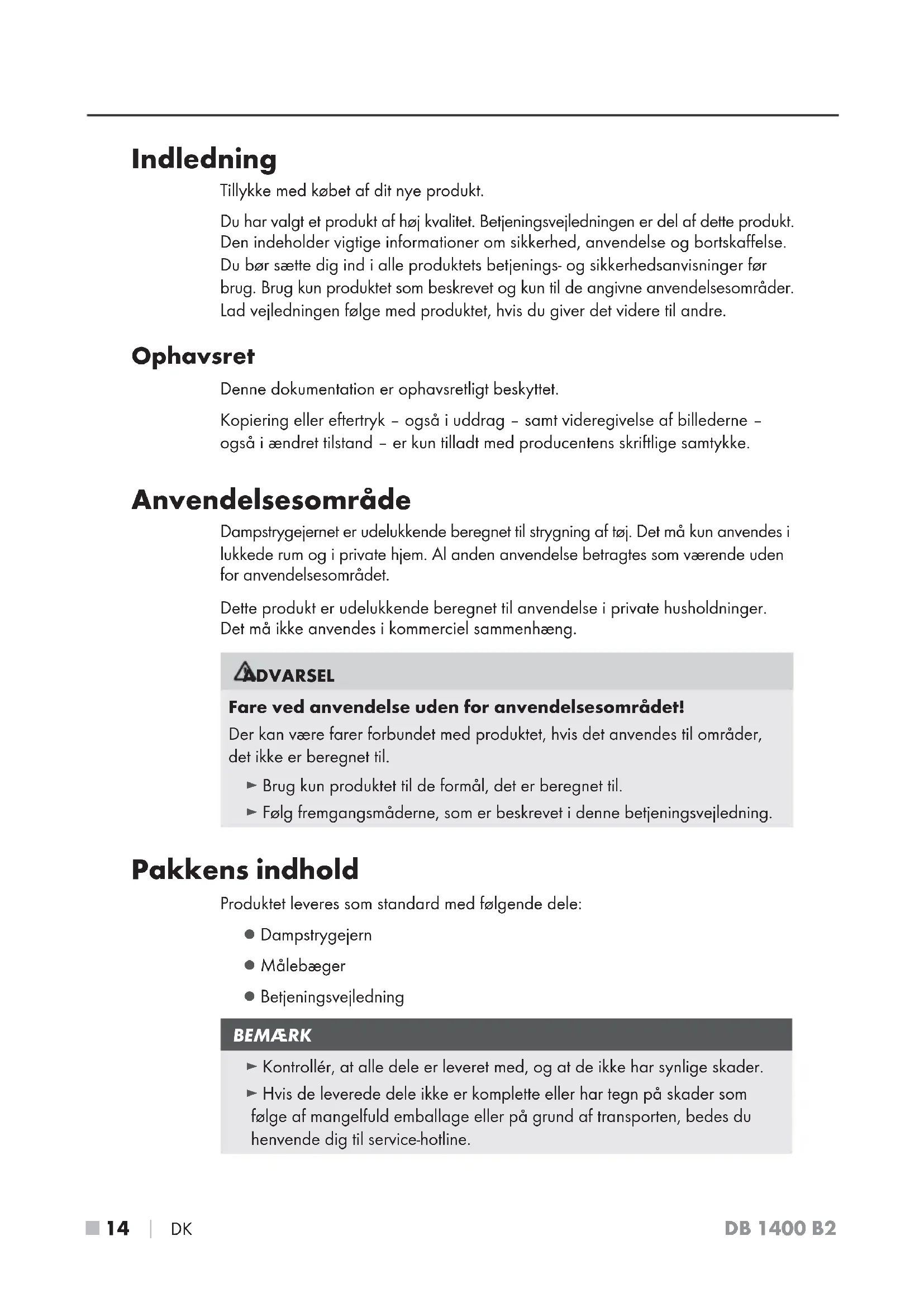 DK DB 1400 B2 Indledning Tillykke med købet af dit nye produkt. Du har valgt et produkt af høj kvalitet. Betjeningsvejledningen er del af dette produkt. Den indeholder vigtige informationer om sikkerhed, anvendelse og bortskaffelse. Du bør sætte dig ind i alle produktets betjenings- og sikkerhedsanvisninger før brug. Brug kun produktet som beskrevet og kun til de angivne anvendelsesområder. Lad vejledningen følge med produktet, hvis du giver det videre til andre. Ophavsret Denne dokumentation er ophavsretligt beskyttet. Kopiering eller eftertryk – også i uddrag – samt videregivelse af billederne – også i ændret tilstand – er kun tilladt med producentens skriftlige samtykke. Anvendelsesområde Dampstrygejernet er udelukkende beregnet til strygning af tøj. Det må kun anvendes i lukkede rum og i private hjem. Al anden anvendelse betragtes som værende uden for anvendelsesområdet. Dette produkt er udelukkende beregnet til anvendelse i private husholdninger. Det må ikke anvendes i kommerciel sammenhæng. ADVARSEL Fare ved anvendelse uden for anvendelsesområdet! Der kan være farer forbundet med produktet, hvis det anvendes til områder, det ikke er beregnet til. ► Brug kun produktet til de formål, det er beregnet til. ► Følg fremgangsmåderne, som er beskrevet i denne betjeningsvejledning. Pakkens indhold Produktet leveres som standard med følgende dele: ▯ Dampstrygejern ▯ Målebæger ▯ Betjeningsvejledning BEMÆRK ► Kontrollér, at alle dele er leveret med, og at de ikke har synlige skader. ► Hvis de leverede dele ikke er komplette eller har tegn på skader som følge af mangelfuld emballage eller på grund af transporten, bedes du henvende dig til service-hotline.DK