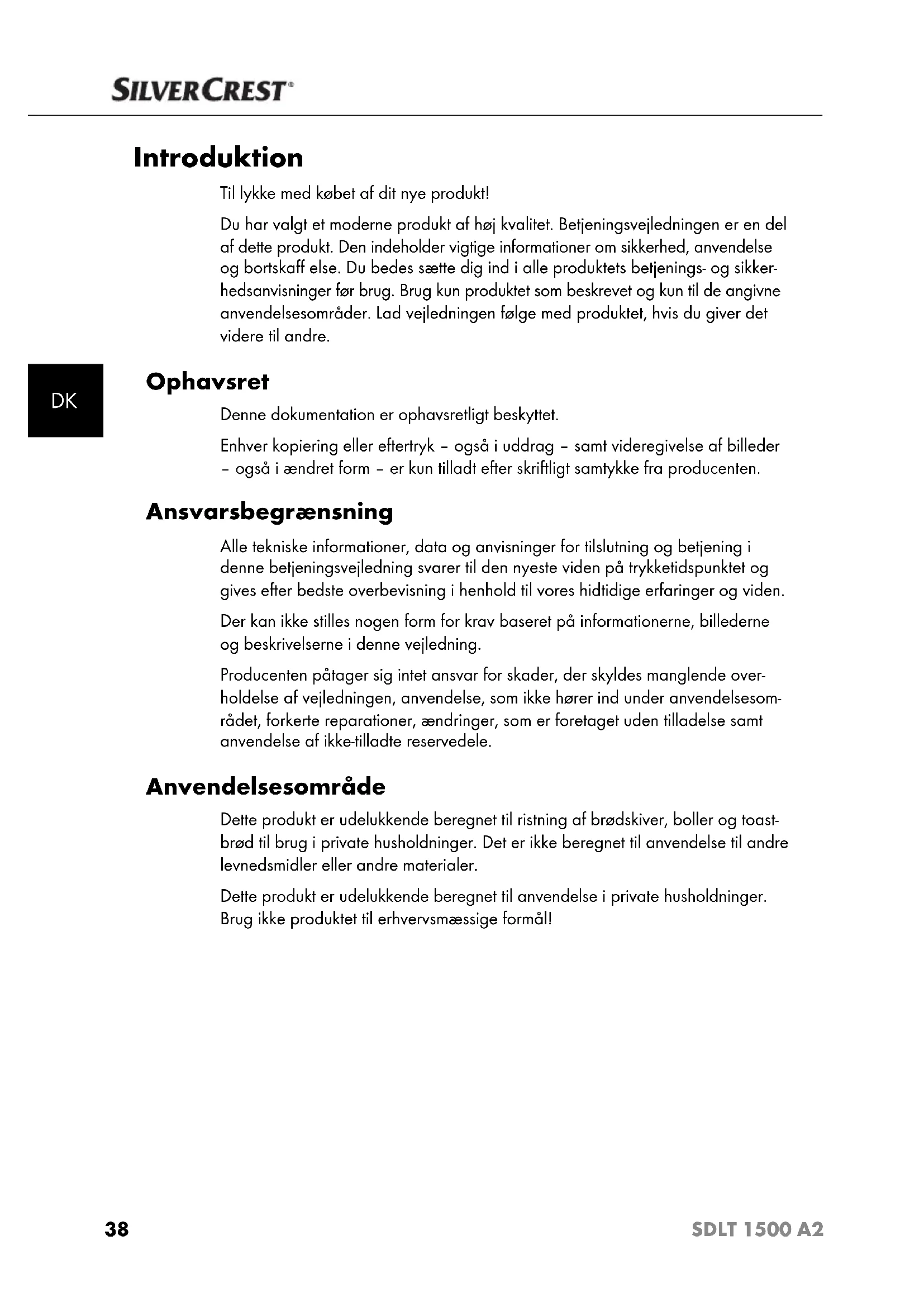 Introduktion Til lykke med købet af dit nye produkt! Du har valgt et moderne produkt af høj kvalitet. Betjeningsvejledningen er en del af dette produkt. Den indeholder vigtige informationer om sikkerhed, anvendelse og bortskaff else. Du bedes sætte dig ind i alle produktets betjenings- og sikker- hedsanvisninger før brug. Brug kun produktet som beskrevet og kun til de angivne anvendelsesområder. Lad vejledningen følge med produktet, hvis du giver det videre til andre. Ophavsret Denne dokumentation er ophavsretligt beskyttet. Enhver kopiering eller eftertryk – også i uddrag – samt videregivelse af billeder – også i ændret form – er kun tilladt efter skriftligt samtykke fra producenten. Ansvarsbegrænsning Alle tekniske informationer, data og anvisninger for tilslutning og betjening i denne betjeningsvejledning svarer til den nyeste viden på trykketidspunktet og gives efter bedste overbevisning i henhold til vores hidtidige erfaringer og viden. Der kan ikke stilles nogen form for krav baseret på informationerne, billederne og beskrivelserne i denne vejledning. Producenten påtager sig intet ansvar for skader, der skyldes manglende over- holdelse af vejledningen, anvendelse, som ikke hører ind under anvendelsesom- rådet, forkerte reparationer, ændringer, som er foretaget uden tilladelse samt anvendelse af ikke-tilladte reservedele. Anvendelsesområde Dette produkt er udelukkende beregnet til ristning af brødskiver, boller og toast- brød til brug i private husholdninger. Det er ikke beregnet til anvendelse til andre levnedsmidler eller andre materialer. Dette produkt er udelukkende beregnet til anvendelse i private husholdninger. Brug ikke produktet til erhvervsmæssige formål! IB_270660_SDLT1500A2_FI_DK_BE.indb 38IB_270660_SDLT1500A2_FI_DK_BE.indb 38 25.08.15 17:1825.08.15 17:1839 SDLT 1500 A2