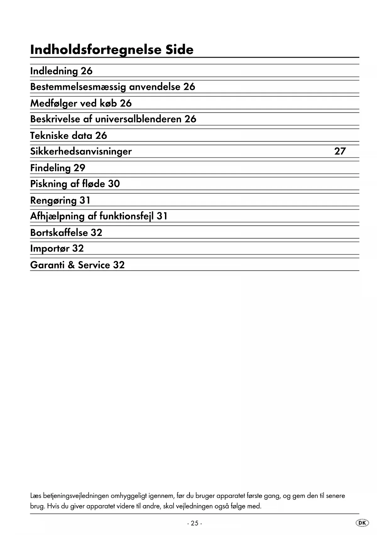 - Ved arbejde med meget skarpe knive er der fare for at komme til skade. Sæt universalblenderen sammen igen efter brug og rengøring, så du ikke kommer til skade på den fritliggende kniv. Sørg for, at børn ikke kan røre ved den.