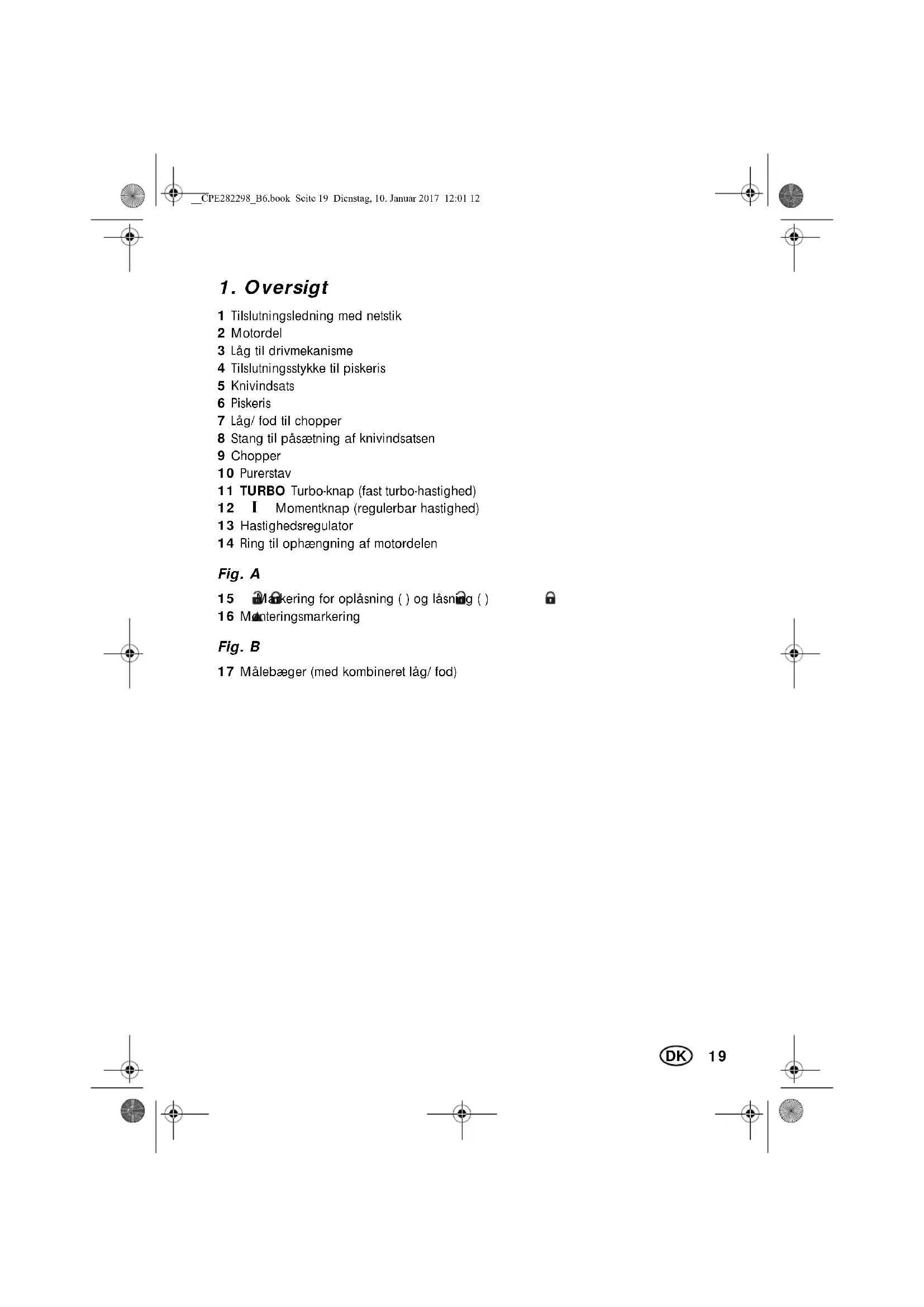 1 Motordel|2 1 Låg til drivmekanisme|3 1 Tilslutningsstykke til piskeris|4 1 Knivindsats|5 1Piskeris|6 1 Låg/fod til chopper|7 1Chopper|9 1 Purerstav|10 1 Målebæger med låg/fod|17 1 Betjeningsvejledning