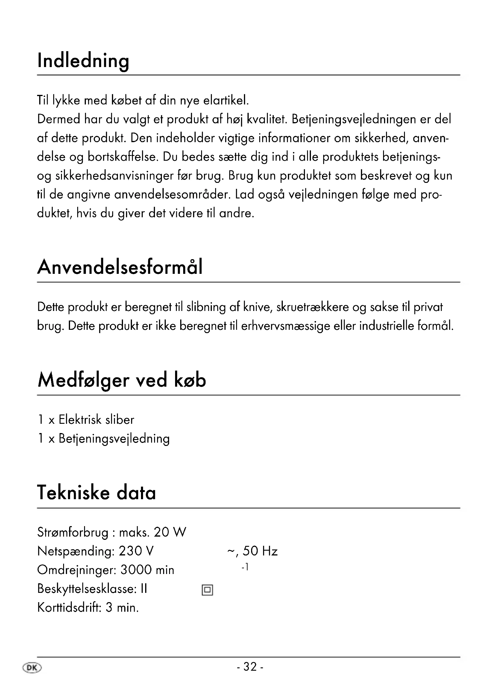 Indledning 32 Anvendelsesformål 32 Medfølger ved køb 32 Tekniske data 32 Beskrivelse af apparatet 33 Sikkerhedsanvisninger 33 Udpakning 35 Opstilling 35 Indstilling 35 Slibning 36 Rengøring og vedligeholdelse 37 Vedligeholdelse 38 Bortskaffelse 39 Importør 39 Garanti og service 39 - 31 -- 32 - Indledning Til lykke med købet af din nye elartikel. Dermed har du valgt et produkt af høj kvalitet. Betjeningsvejledningen er del af dette produkt. Den indeholder vigtige informationer om sikkerhed, anven- delse og bortskaffelse. Du bedes sætte dig ind i alle produktets betjenings- og sikkerhedsanvisninger før brug. Brug kun produktet som beskrevet og kun til de angivne anvendelsesområder. Lad også vejledningen følge med pro- duktet, hvis du giver det videre til andre. Anvendelsesformål Dette produkt er beregnet til slibning af knive, skruetrækkere og sakse til privat brug. Dette produkt er ikke beregnet til erhvervsmæssige eller industrielle formål. Medfølger ved køb 1 x Elektrisk sliber 1 x Betjeningsvejledning Tekniske data Strømforbrug : maks. 20 W Netspænding: 230 V