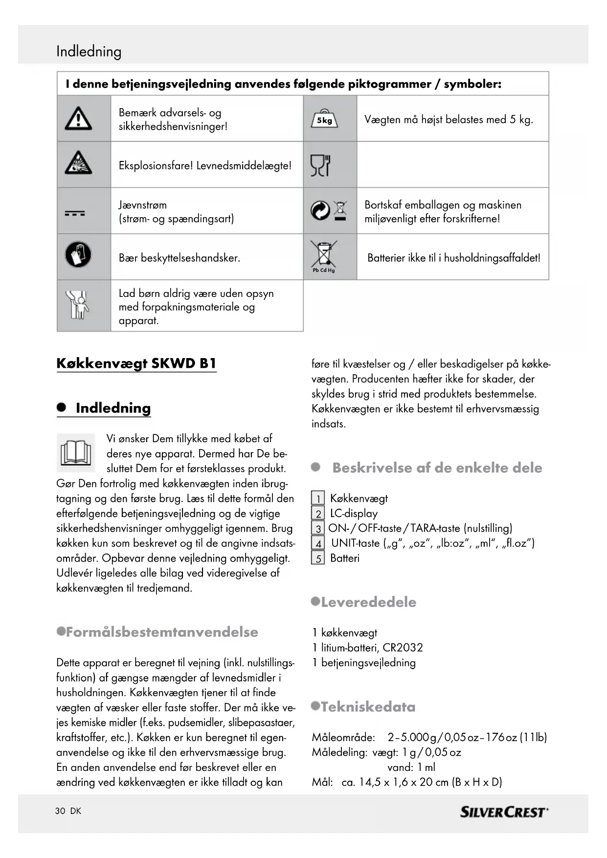 Batteri Leverede dele 1 køkkenvægt 1 litium-batteri, CR2032 1 betjeningsvejledning Tekniske data Måleområde: 2–5.000 g / 0,05 oz–176 oz (11lb) Måledeling: vægt: 1 g / 0,05 oz vand: 1 ml Mål: ca. 14,5 x 1,6 x 20 cm (B x H x D) I denne betjeningsvejledning anvendes følgende piktogrammer / symboler: Bemærk advarsels- og sikkerhedshenvisninger! 5 kg Vægten må højst belastes med 5 kg. Eksplosionsfare! Levnedsmiddelægte! Jævnstrøm (strøm- og spændingsart) Bortskaf emballagen og maskinen miljøvenligt efter forskrifterne! Bær beskyttelseshandsker. Pb Cd Hg Batterier ikke til i husholdningsaffaldet! Lad børn aldrig være uden opsyn med forpakningsmateriale og apparat.31 DK Indledning / Generelle sikkerhedshenvisninger Batteri: 1 x 3 V litium-batteri (CR2032 litium-knapcelle) Producent: MGG Elektro GmbH Steinstr. 27 40210 Düsseldorf, Germany Generelle sikkerheds- henvisninger LIVS-