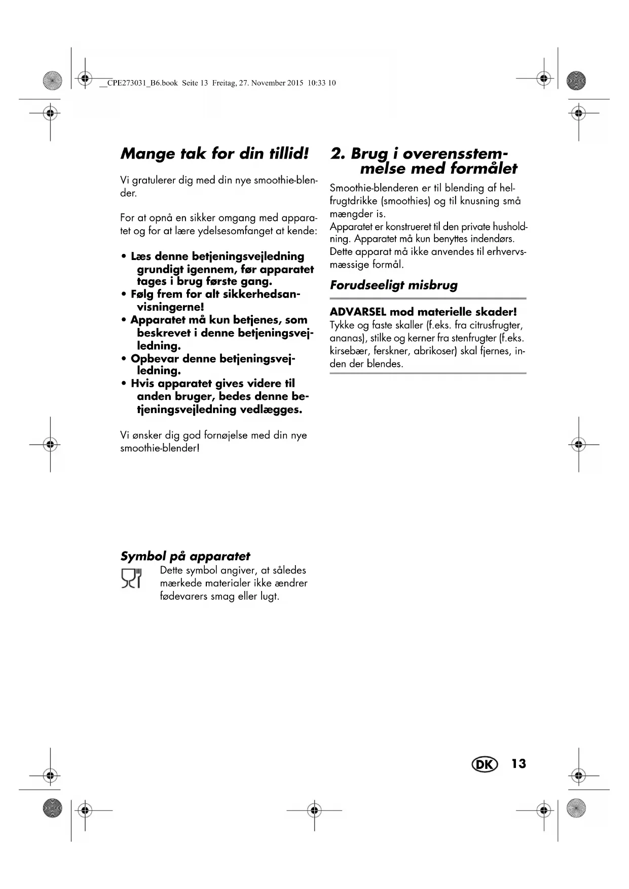 melse med formålet Smoothie-blenderen er til blending af hel- frugtdrikke (smoothies) og til knusning små mængder is. Apparatet er konstrueret til den private hushold- ning. Apparatet må kun benyttes indendørs. Dette apparat må ikke anvendes til erhvervs- mæssige formål. Forudseeligt misbrug ADVARSEL mod materielle skader! Tykke og faste skaller (f.eks. fra citrusfrugter, ananas), stilke og kerner fra stenfrugter (f.eks. kirsebær, ferskner, abrikoser) skal fjernes, in- den der blendes.