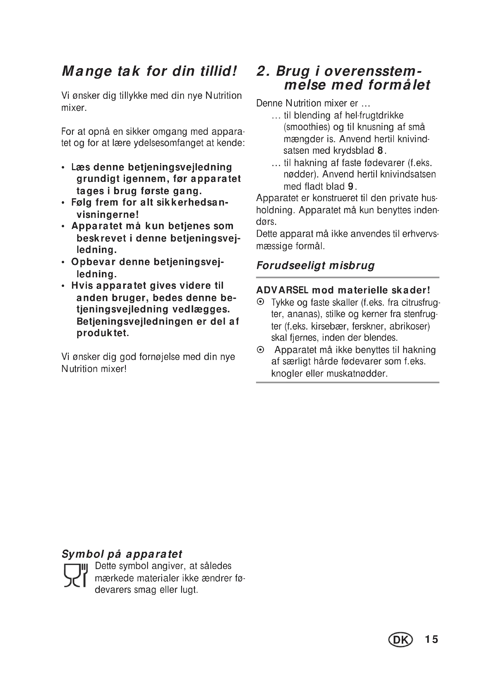 - Hvis apparatet gives videre til anden bruger, bedes denne be- tjeningsvejledning vedlægges. Betjeningsvejledningen er del af produktet. Vi ønsker dig god fornøjelse med din nye Nutrition mixer! Symbol på apparatet Dette symbol angiver, at således mærkede materialer ikke ændrer fø- devarers smag eller lugt.
