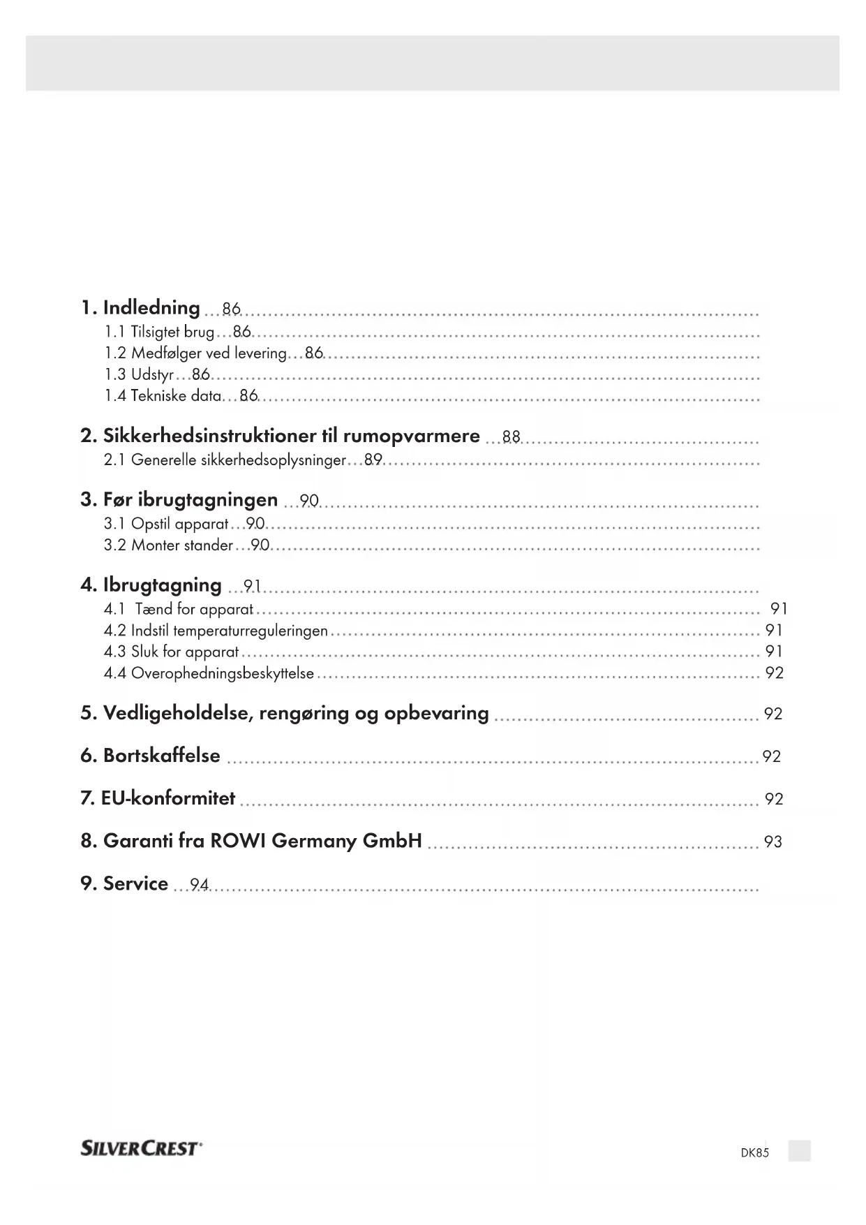 2. Sikkerhedsinstruktioner til rumopvarmere 88