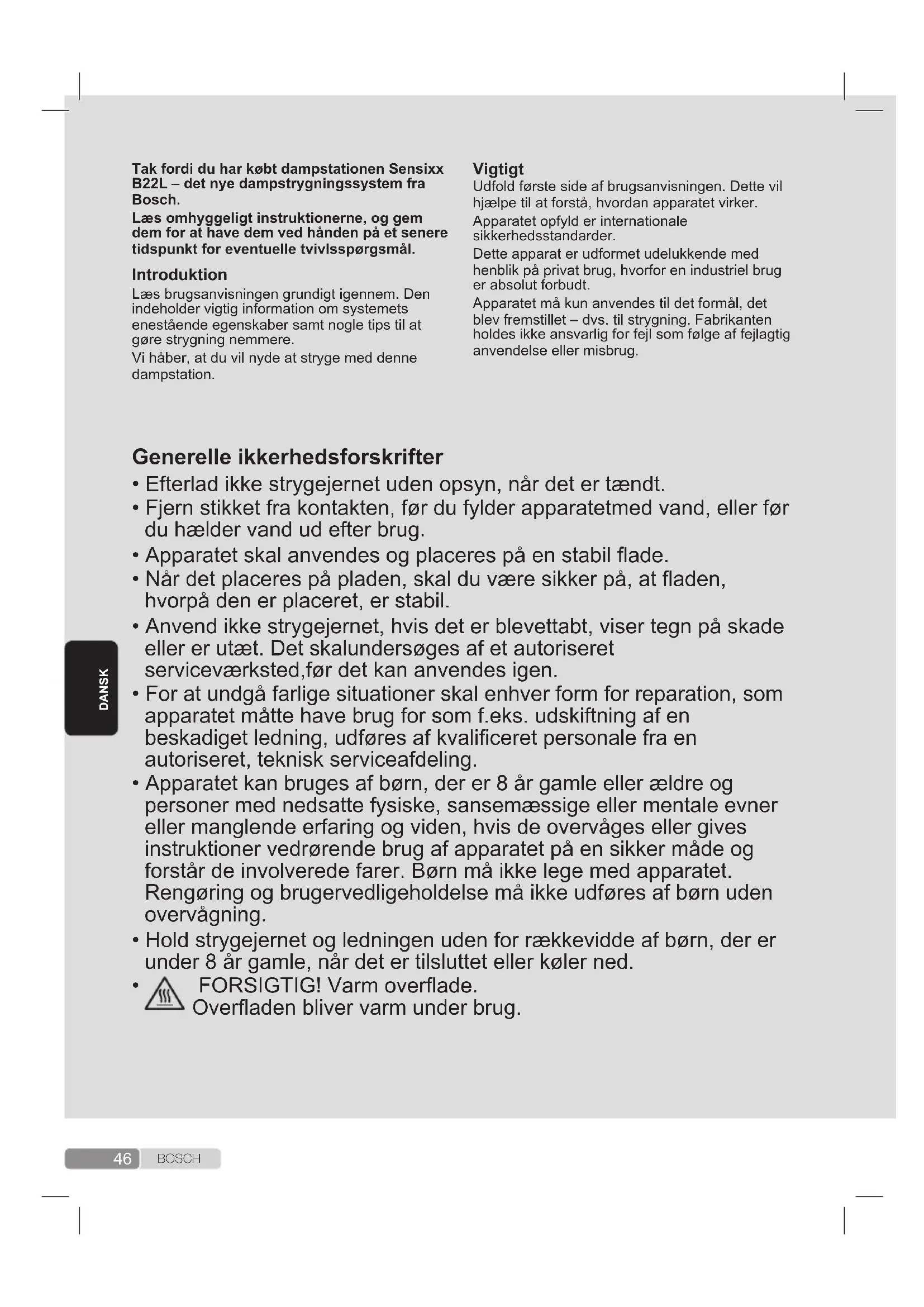 Apparatet når høje temperaturer og producerer damp under brug, hvilket kan forårsage skoldning eller forbrænding i tilfælde af ukorrekt anvendelse. Dampslangen, basisstationen, metalpladen nederst på den aftagelige strygeplade (2) og især strygejernet kan blive varme, når de bruges. Det er helt normalt. Ret aldrig dampen mod mennesker eller dyr. Lad ikke ledningen komme i kontakt med strygebasen, mens denne er varm. Vær opmærksom på, at systemet kan fortsætte med at dampe i kort tid efter deaktivering af dampudløseren. Dette er en normal funktion.47 B O S C H Udfold første side af brugsanvisningen. Dette vil hjælpe til at forstå, hvordan apparatet virker.Apparatet opfyld er internationale sikkerhedsstandarder.Dette apparat er udformet udelukkende med henblik på privat brug, hvorfor en industriel brug er absolut forbudt.Apparatet må kun anvendes til det formål, det blev fremstillet – dvs. til strygning. Fabrikanten holdes ikke ansvarlig for fejl som følge af fejlagtig anvendelse eller misbrug.