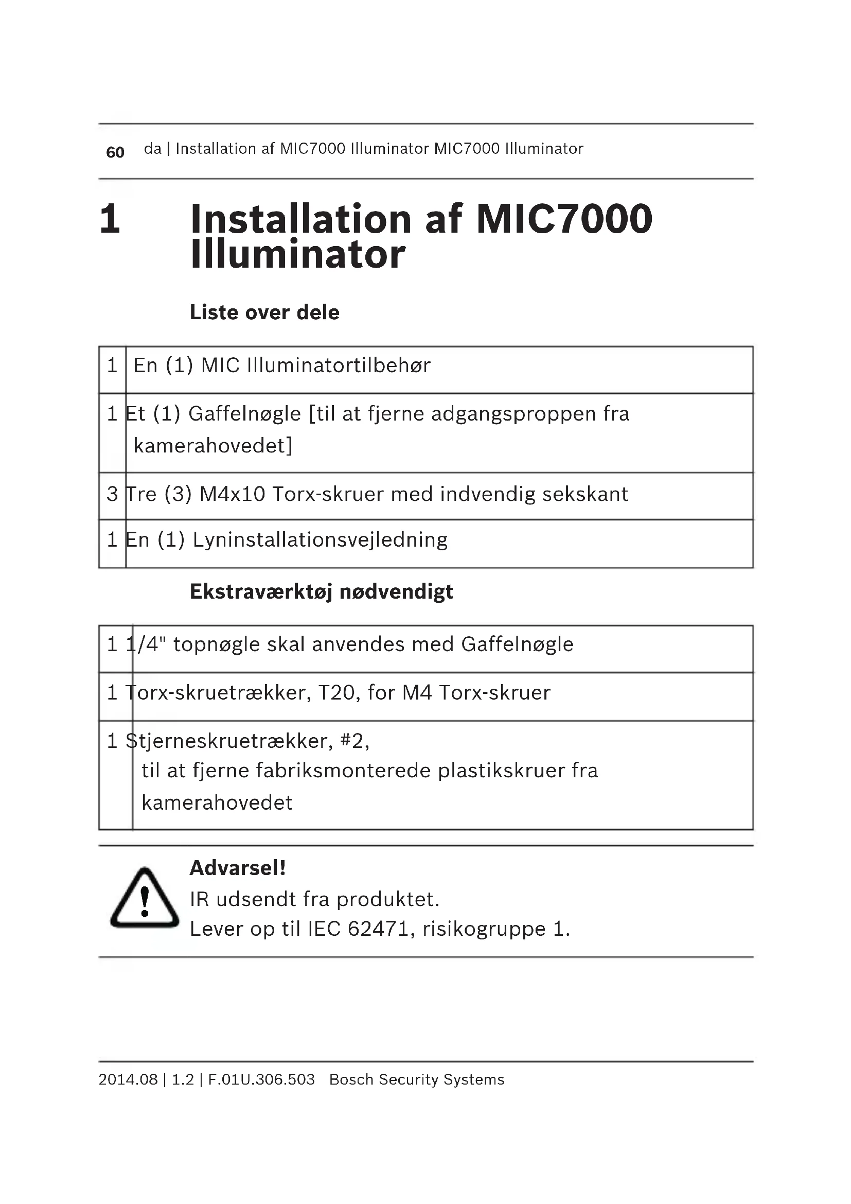 da | Installation af MIC7000 Illuminator MIC7000 Illuminator 2014.08 | 1.2 | F.01U.306.503 Bosch Security SystemsOplysning! Dette produkt er blevet testet i henhold til standard IEC62471:2006 "Fotobiologisk sikkerhed af lamper og lampesystemer". Produktets emissioner overstiger grænseværdierne ifølge EXEMPT Group for både det blå lysområde, der er farligt for nethinden, og det infrarøde lysområde, der er farligt for hornhinden, som defineret i IEC 62471:2006. Produktet anses for at overholde eksponeringsgrænseværdierne i risikogruppe 1 for infrarøde og hvide lysdioder. Se betjeningsmanualen MIC7000 for fuldstændige oplysninger om belysningssikkerhed. Oplysning! I tilfælde af, at MIC-kameraet skal forsynes med både illuminator og solskærm som ekstraudstyr, skal illuminatoren installeres først. MIC7000-modeller til ekstremt lave temperaturer understøtter ikke brugen af illuminator.