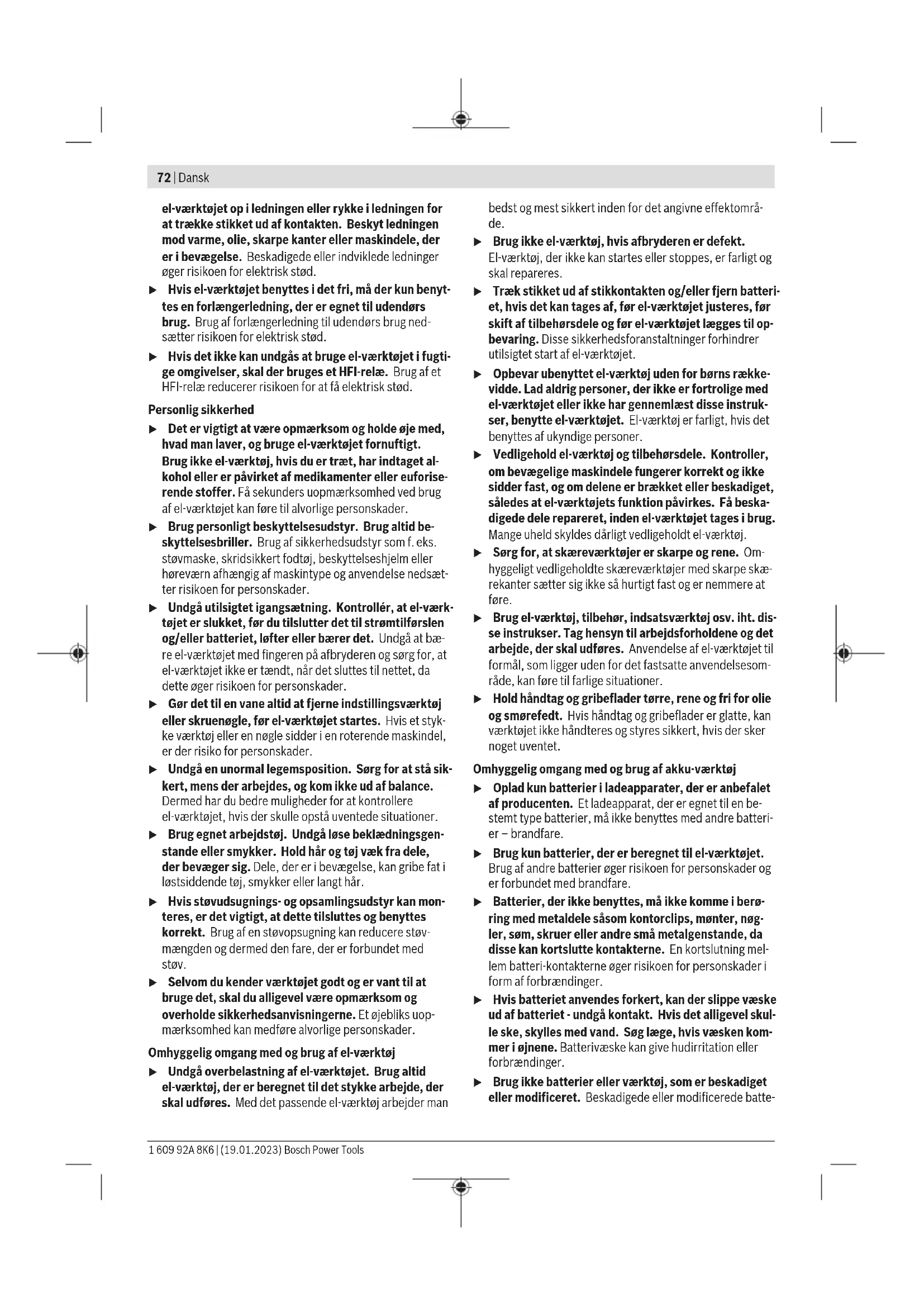 Udtagning af udskiftningsborepatron (se billede C) – Træk udskiftningsborepatronens låsering (6) bagud, hold den fast i denne position, og træk SDS-plus-udskiftnings- borepatronen (2) eller den selvspændende udskiftnings- borepatron (1) af fremefter. – Beskyt udskiftningsborepatronen mod tilsmudsning efter aftagningen. Isætning af udskiftningsborepatron (se billede D) u Brug kun modelspecifikt originalt udstyr, og kontrol- lér i den forbindelse antallet af koderiller (25). Kun udskiftningsborepatroner med to eller tre koderiller er tilladte. Hvis du anvender en udskiftningsborepatron, der ikke er egnet til el-værktøjet, kan indsatsværktøjet fal- de ud under arbejdet. – Rengør udskiftningsborepatronen før isætning, og smør indstiksenden med en smule fedt. – Grib fat omkring SDS-plus-udskiftningsborepatronen (2) hhv. den selvspændende udskiftningsborepatron (1) med hele hånden. Skub udskiftningsborepatronen dre- jende på borepatronholderen (24), til der høres et tyde- ligt klik. – Udskiftningsborepatronen fastlåses automatisk. Kontrol- lér, at udskiftningsborepatronen sidder rigtigt fast ved at trække i låsen. 1 609 92A 8K6 | (19.01.2023) Bosch Power ToolsDansk | 77 Værktøjsskift Støvbeskyttelseskappen (4) forhindrer i stort omfang, at bo- restøv trænger ind i værktøjsholderen under brug. Når værk- tøjet sættes i, skal man være opmærksom på, at støvbeskyt- telseskappen (4) ikke beskadiges. u En beskadiget støvbeskyttelseskappe skal straks ud- skiftes. Det anbefales at lade en kundeservice udføre arbejdet. Værktøjsskift (SDS-plus) Isætning af SDSplus-indsatsværktøj (se billedeE) Med SDS-plus-borepatronen kan du skifte indsatsværktøj nemt og bekvemt uden brug af andre værktøjer. – GBH18V-26F: Isæt SDS-plus-udskiftningsborepatronen (2). – Rengør indsatsværktøjets indstiksende, og smør den med en smule fedt. – Isæt indsatsværktøjet i værktøjsholderen med en dreje- bevægelse, til det automatisk låses. – Kontrollér, at værktøjet sidder rigtigt fast ved at trække i låsen. SDS-plus-indsatsværktøjet er systembetinget frit bevæge- ligt. Derved opstår der en rundløbsafvigelse ved tomgang. Dette har ingen indvirkning på borehullets nøjagtighed, da boret centreres automatisk ved boring. Udtagning af SDS-plus-indsatsværktøj (se billede F) – Skub låsekappen (5) tilbage, og tag indsatsværktøjet ud. Udskiftning af værktøj tandkransborepatron GBH 18V-26 Isætning af indsatsværktøj (se billede G) Bemærk: Brug ikke værktøj uden SDS-plus til hammerbor- ing eller mejsling! Værktøj uden SDS-plus og dets borepa- tron beskadiges under hammerboring og mejsling. – Isæt tandkransborepatronen (22). – Åbn tandkransborepatronen (22) ved at dreje, indtil værktøjet kan sættes i. Isæt værktøjet. – Sæt borepatronnøglen (26) i de pågældende boringer på tandkransborepatronen (22), og spænd værktøjet ensar- tet fast. – Drej slag-/drejestop-afbryderen (16) til positionen "Bor- ing". Udtagning af indsatsværktøj (se billede H) – Drej kappen på tandkransborepatronen (22) til venstre med den medfølgende borepatronnøgle (26), indtil ind- satsværktøjet kan tages ud. Værktøjsskift selvspændende udskiftningsborepatron