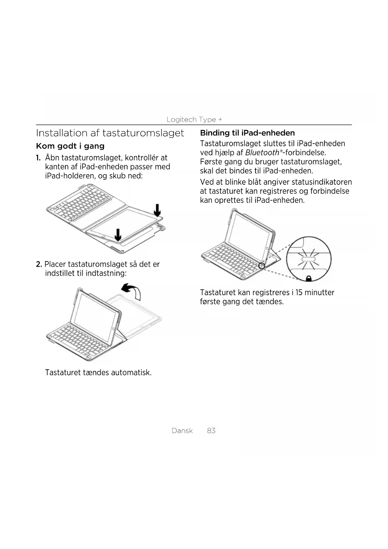 en pinkode, skal du benytte tastaturomslaget til indtastningen og ikke det virtuelle tastatur på iPad- enheden. Når forbindelsen er oprettet, lyser statusindikatoren blåt et øjeblik før den slukkes.Logitech Type + Dansk 85 Sådan bruges tastaturomslaget To visningstilstande Tastaturomslaget kan indstilles til enten søgning på internettet eller indtastning. Placer tastaturomslaget så det er indstillet til indtastning. En magnet sørger for at iPad-enheden holdes på plads: Tastaturet tændes automatisk når tastaturomslaget indstilles til indtastning. Placer tastaturomslaget så det er klar til søgning på internettet: Tastaturet slukkes automatisk når tastaturomslaget indstilles til søgning på internettet.Logitech Type + 86 Dansk Sådan fjernes iPad-enheden Bøj et af hjørnerne på iPad-holderen tilbage for at fjerne enheden fra omslaget: Din iPad er nu taget af: Opbevaring og transport af iPad- enheden
