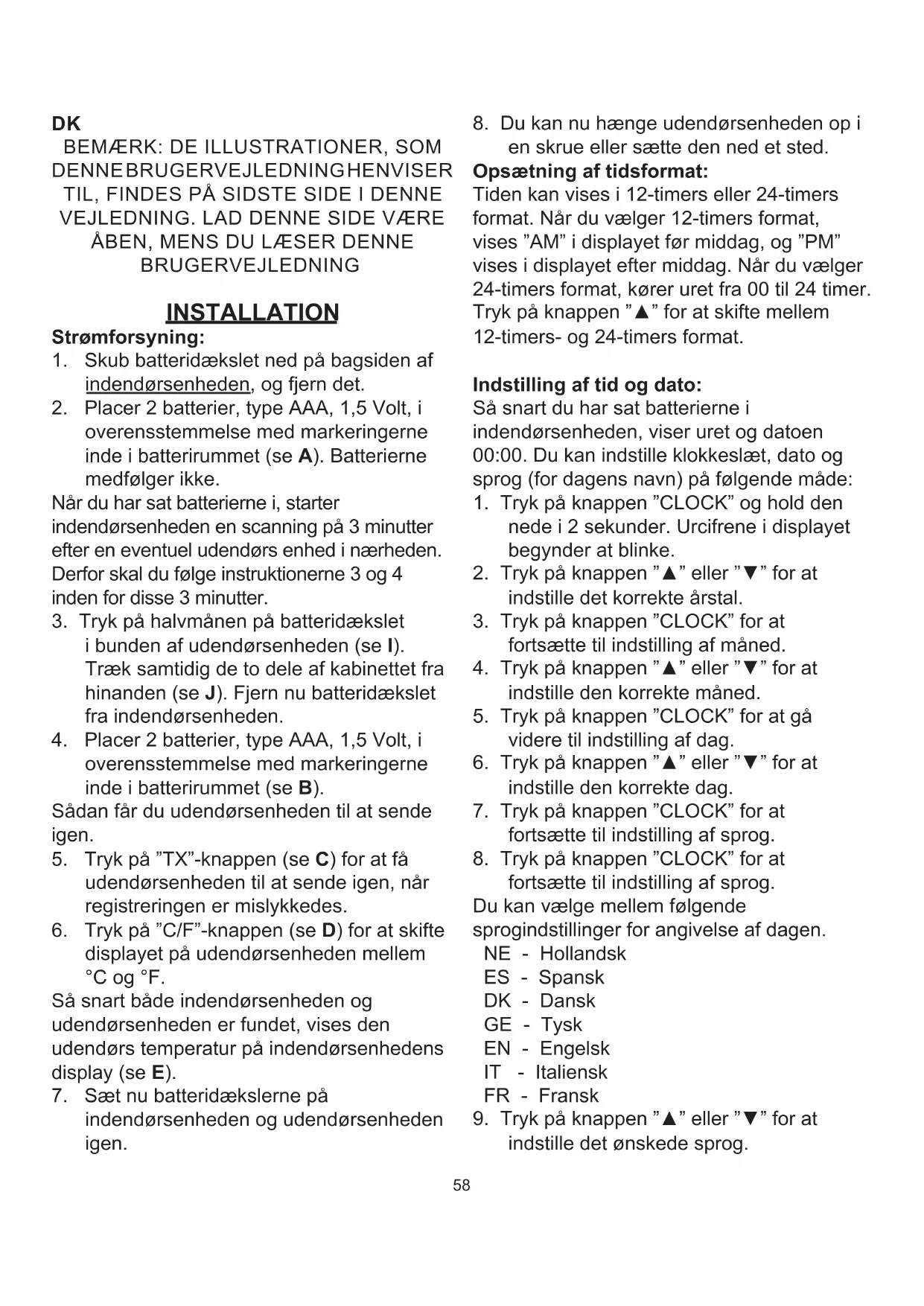 en skrue eller sætte den ned et sted. Opsætning af tidsformat: Tiden kan vises i 12-timers eller 24-timers format. Når du vælger 12-timers format, vises ”AM” i displayet før middag, og ”PM” vises i displayet efter middag. Når du vælger 24-timers format, kører uret fra 00 til 24 timer. Tryk på knappen ”▲” for at skifte mellem 12-timers- og 24-timers format. Indstilling af tid og dato: Så snart du har sat batterierne i indendørsenheden, viser uret og datoen 00:00. Du kan indstille klokkeslæt, dato og sprog (for dagens navn) på følgende måde: